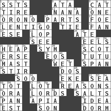 ACROSS 1. Fast planes 5. _ moment's notice (2 wds.) 8. Domesticated feline 11. Hoop that covers a wheel 12. Grandmother 14. Single 15. U. of Maine site 17. Actors' quests 18. Enemy 19. Small, flat, pigmented spot on the skin 21. Standoff 22. Air blower 23. Compass dir. 24. Chop off 25. Had dinner 27. Observe 28. Snakelike fish 31. Pile 35. Symbol (abbr.) 37. Native of Scotland 38. Celtic language 39. Greek goddess of the dawn 41. Ballerina skirt 42. Vertical spar for supporting sails 43. Soggy 45. Connect, as a bridge 46. Use a swizzle stick 47. Two (Sp.) 49. "Barney Miller" actor Jack 51. Supplement with great effort 52. Ocean 55. Small child 57. Car dealer's back yard 60. Thinks logically 62. Mouth or opening 63. Nobles 65. Table seasonings 66. Baking dish 67. Capital of Western Samoa 68. The main thing one is thinking about 69. Eastern Standard Time (abbr.) 70. Manchild 71. Dormintory (informal) DOWN 1. Fur scarf 2. Founders of families 3. Heavy duty weighing machine 4. Emitted 5. Santa ___, CA 6. Small pie 7. Opposed to 8. Java holder (2 wds.) 9. Small Philippine buffalo 10. Adolescent 13. Toward the sea 16. Petroleums 17. Wimpy's pal 20. Travels 26. Trials 29. Globular water bottle used in Asia 30. Make senseless or dizzy 31. Folds over and sews together 32. Part of Q.E.F. 33. Aide 34. Stone: prefix 36. Cut the grass 40. Spring feasts 44. Puff or smoke 48. Oceans 50. Spanish pot 52. Twentieth part of a lira 53. Keyboard key 54. Indian state 55. Drink excessively 56. Mouths or openings 58. I made a mistake 59. Musical group of three 61. Expressed in words 64. One of the 12 tribes of Israel