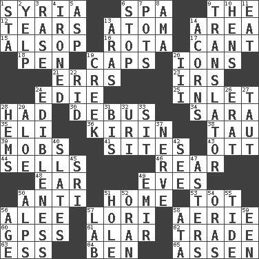 ACROSS 1. Damascus' land 6. Health resort 9. Definite Article 12. Separates forcefully 13. Tiny particle 14. Type of rug 15. Columnist Joseph or Stewart 16. Round or rotation of duties 17. Patter 18. Writing instrument 19. Balmoral and tarboosh 20. Charged atoms 21. Blunders 23. Big collection agency 24. Singer Brickell 25. An arm off of a larger body of water 28. Possessed 30. To get out of a bus 34. "Two Mules for Sister ____" 35. Biblical high priest 36. Japanese brewing company 38. The 19th letter of the Greek alphabet 39. Disorderly crowds 41. Settings 43. Baseball player Mel 44. Makes a sale 46. Tail end 48. Hearing organ 49. Nights before holidays 50. Opposed to 51. Dwelling 53. Small child 56. Toward shelter 57. Australian parrot (variant) 58. Nest on high 60. Global Positioning Systems (abbr.) 61. Having or resembling wings 62. Buy and sell 63. Double-curved letter 64. Benjamin's nick name 65. NE Netherlands city DOWN 1. R.R. building 2. Sharp bark 3. Raze (variant) 4. Pressed 5. Cleo's killer 6. Close up, plug up 7. Plant holders 8. Nursemaid (var.) 9. Interpreter 10. Coop moms 11. Ingest 13. Ancient river in northeast Turkey 14. Oak nuts 19. Small stream 20. One more than two 22. To free from 24. The property of being fit to eat 26. Part of Q.E.F. 27. Tense 28. Cloth borders 29. Medicinal plant 31. Altar cloth linen 32. RI univ. 33. Be seated 37. Boldness 40. Chalkboards 42. Perceive with the eye 45. _ Lanka 47. Michaelmas daisies 49. Arab leader 50. High mountains 51. Hollow 52. Northwest Algerian city 54. Mouths or openings 55. Event that recurs at intervals 56. Grow older 57. Experiment locale 58. _ moment's notice (2 wds.) 59. Car or cant ending