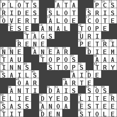 ACROSS 1. Graphs 6. _ moment's notice (2 wds.) 9. Personal Computers (abbr.) 12. Amusement-park features 13. Notch 14. Indian titles of respect 15. Unconcealed 16. _ vera 17. ____ d'Azur (French Riviera) 18. Compass dir. 19. Of or related to the anus 20. Drink excessively 21. Labels 23. RI univ. 24. French philosopher Descartes 25. _ dish (used to culture cells) 28. Compass dir. 30. Approach 34. South Vietnam president (1954) 35. The 19th letter of the Greek alphabet 36. Traditional theme or motif 38. American Automobile Association (abbr.) 39. Lodging establishments 41. Ceases 43. Attempt to accomplish something 44. Moves on water 46. Assistant 48. Rowing implement 49. Johnson of "Laugh-In" 50. Against 51. Raised platform 53. Distress signal 56. Writer Wiesel 57. Colored 58. 61 cubic inches 60. Backtalk 61. Small Philippine buffalo 62. First name in cosmetics 63. Teat (slang) 64. Lair 65. Fur scarf DOWN 1. Adept person 2. Moving, as bait 3. Lyric poems 4. Cigar-shaped 5. Fast jet (abbr.) 6. Silent film actress Nazimova 7. Implement 8. Had dinner 9. Conciliate 10. Quote 11. Compass dir. 13. Without 14. Tallied 19. Rep 20. Uncastrated adult male sheep 22. Santa ___, CA 24. One who advocates reunion 26. Located in or toward the back 27. "If ____ say so..." 28. Nuclear Threat Initiatives 29. Nanny 31. Greek goddess of the dawn 32. Fitting 33. Friend of Pooh 37. Practice fights 40. Chalkboards 42. Be seated 45. Indian title of respect (Mr.) 47. Cease 49. Opera by Verdi 50. Mountain range southwest of Kyrgyzstan 51. Unit of force 52. A really long time 54. Von Bismarck 55. Sew up the eyelids of hawks and falcons 56. Eastern Standard Time (abbr.) 57. June honoree 58. French article 59. To riddle
