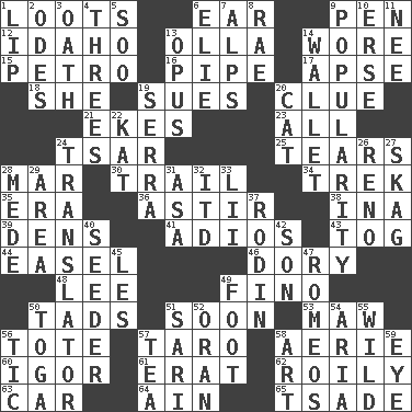 ACROSS 1. Plunders 6. Hearing organ 9. Writing instrument 12. Potato state 13. Spanish pot 14. Had on 15. Stone: prefix 16. Corncob 17. Domed church section 18. A female animal or person 19. Takes to court 20. A slight indication 21. Makes supply last 23. Everything 24. Russian ruler of old 25. Pulls apart 28. Impair 30. Go after with the intent to catch 34. Long journey 35. Epoch 36. Moving about 38. _ tizzy (2 wds.) 39. Lairs 41. Goodbye (Sp.) 43. Coat; cloak 44. Artist's stand 46. Rowboat 48. Area sheltered from the wind 49. Fine (Spanish) 50. Small amounts or degrees 51. Within a short period 53. Opening into something insatiable 56. Haul 57. Edible starchy tuberous root 58. Nest on high 60. Russian composer Stravinsky 61. Part of Q.E.F. 62. Turbulent 63. Automobile 64. The 18th letter of the Arabic alphabet 65. Sadhe (variant) DOWN 1. Mouth edge 2. Lyric poems 3. Pledge 4. Triads 5. "Barney Miller" actor Jack 6. Writer Wiesel 7. High mountains 8. Actress Charlotte 9. Teen's desire 10. Celtic language 11. Born 13. Musical composition 14. Place for singles 19. Father Junipero _ 20. Domesticated feline 22. Krazy ___ of comics 24. Interpreter 26. Western Nevada city 27. Heroin 28. Ancient Persian 29. Type of rug 31. White ___ sheet 32. It would 33. Cards in a Roman deck? 37. "The Thinker" sculptor 40. Sowing specialist 42. Manchild 45. French article 47. Lover boys 49. 12 inches 50. Ancient Roman robe 51. Indian skirt 52. Northwest Algerian city 54. Roberta Peters solo 55. Rampant 56. Nervous spasm 57. Beverage made from leaves 58. Tate display 59. Sight organ