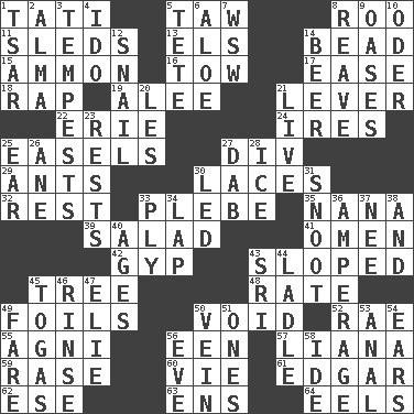 ACROSS 1. Jacques of French films 5. The 23rd letter of the Hebrew alphabet 8. Friend of Pooh 11. Bobsleighs 13. Raised railways 14. Necklace unit 15. ID or VA city 16. Pull behind 17. Relaxation 18. Reproach for some lapse or misdeed 19. Toward shelter 21. Prying instrument 22. One of the Great Lakes 24. Angers 25. Artist's stands 27. HTML Container Element 29. Pismires 30. Shoestrings 32. Relief 33. First-year military academy student 35. Nanny 39. Vegetable dish 41. Sign of things to come 42. Swindle 43. Slanted 45. Woody plant 48. Pace 49. Fencing necessities 50. Null 52. Actress Charlotte 55. Hindu god of fire 56. Car or cant ending 57. Woody, climbing, usually tropical plant 59. Raze (variant) 60. Compete 61. _ Allan Poe 62. Compass dir. 63. Followers of ems 64. Snakelike fish DOWN 1. Russian ruler of old 2. _ mater 3. Storms 4. Wedding promise 5. False hair 6. _ vera 7. Compass dir. 8. Break or tear apart 9. Fertile tracts in a desert 10. River in Europe 12. Slow-paced one 14. Fermented drink made from hops 20. French article 21. Moving, as bait 23. Musical pauses 25. Ewer handle 26. A saturated hydrocarbon 27. Small moist lump or mass 28. Frozen water 30. Directed 31. Snob 33. Travel a route regularly 34. Pet locale 36. Electrical Measurement 37. Born 38. Also 40. Matures 43. _ Lanka 44. Dipping utensil 45. Ancient Roman robes 46. Remove soap 47. Writer Wiesel 49. Conductor's collection 50. Distinctive style or manner 51. Singles 53. Of or related to the anus 54. Hearing organs 56. First lady 58. Binary compound
