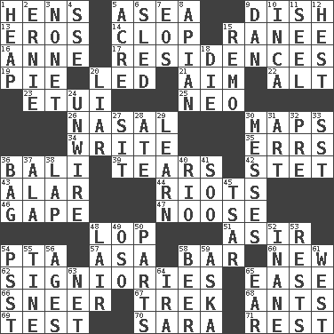 ACROSS 1. Coop moms 5. Toward the sea 9. Food container 13. Greek god of love 14. Hoof sound 15. The wife of a rajah (variant) 16. Queen of England 1702-14 17. Homes 19. Sliced dessert 20. Directed 21. Direct toward a target or goal 22. The first octave above the treble staff 23. Needle case 25. Modern: prefix 26. Rhinal 30. Atlas contents 34. Compose 35. Blunders 36. Indonesian resort city 39. Lacerates 42. Proofreading order 43. Having or resembling wings 44. Disturbances 46. Open wide 47. Trap for birds or small mammals 48. Trim (branches) 51. SW Saudi Arabia district 54. Parent Teacher Assoc. 57. White ___ sheet 58. Oblong piece of solid material 60. ___ Haven, CT 62. Seigniories (variant) 65. Comfort 66. Contemptuous expression 67. Long journey 68. Pismires 69. Trial 70. "Two Mules for Sister ____" 71. Remainder DOWN 1. Pile 2. Bert's buddy 3. Music written for nine 4. Compass dir. 5. Land measure 6. Downhill vehicle 7. Greek goddess of the dawn 8. Bee-related 9. Daniel's nick name 10. South American Indian 11. Stitch closed the eyes of (a falcon) 12. Command 15. San ____ (Riviera town) 18. Expire 20. One who doesn't tell the truth 24. Undo the wiring of 27. Be seated 28. Had dinner 29. Memorize 30. Makes clutter 31. Nonscientific branch of learning 32. Before (prefix) 33. Fast jet (abbr.) 36. Container for groceries 37. Insect wing 38. Infant locale 40. _ de Janeiro 41. "Barney Miller" actor Jack 45. Russian ruler of old 48. Den 49. Bear (Spanish) 50. Pieces 52. Silly 53. Musical pauses 54. Inconspicuous attention getter 55. Prong on a fork 56. Eons 58. Fermented drink made from hops 59. "____ silly question..." 61. Compass direction 63. Fish or hair follower 64. Retirement account (abbr.) 65. Hearing organ
