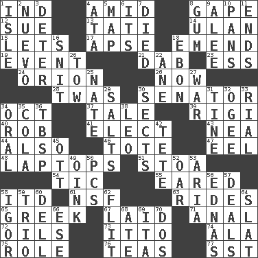 ACROSS 1. Working for oneself (abbr.) 4. Among 8. Open wide 12. Take to court 13. Jacques of French films 14. ____ Bator 15. Allows 17. Domed church section 18. Make improvements or corrections to 19. Happening 21. Apply (a substance) by light strokes 23. Curvy letter 24. Greek mythologigal hunter 26. Immediately 28. It was, poetically 30. Legislator 34. Sep. follower 37. Story 39. Swiss mountan, "Queen of the Mountains" 40. Director Reiner 41. Voters do this 43. Teachers' org. 44. In addition 46. Lug 47. Snakelike fish 48. Portable computers 51. Portico 54. Nervous spasm 55. Having ears or earlike features 58. It would 61. Science/research agcy. 63. Amusement-park features 65. Of Greece 67. Put down 71. Of or related to the anus 72. Lubricates 73. "Tell ____ the Marines!" 74. Insect wing 75. Hero or heavy, e.g. 76. Afternoon social gatherings 77. Fast jet (abbr.) DOWN 1. Capri or Wright 2. New (sp.) 3. Prevent from occurring 4. "One Day ___ Time" 5. Atlas unit 6. ___ a Wonderful Life 7. Passed on 8. Chewing product 9. Toward shelter 10. Baking dishes 11. Extremities 16. In a ____ (agitated or irritated) 18. Inky black, to poets 20. Pull behind 22. One (Scot) 25. Nathan's nickname 27. Armed conflict 29. Table seasonings 30. Religious groups 31. Prong on a fork 32. Double curve, resembling the letter S 33. Monetary unit of Yemen 34. Of the mouth 35. Root beer relative 36. Cook's measure (abbr.) 38. Lion 42. Wig 45. Baseball player Mel 49. Pig sound 50. Personal Computers (abbr.) 52. Rowing implement 53. Roberta Peters solo 56. Ferber et al. 57. Allots cards 58. Composer Stravinsky 59. Musical group of three 60. Small valley 62. Sudden quick movement 64. Narrow board 66. Compass dir. 68. Had dinner 69. Call ___ day 70. Two (Sp.)