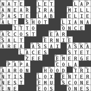 ACROSS 1. Nathan's nickname 5. Allow 8. Pet locale 11. Approach 13. Lyricist Gershwin 14. Place where flour is made 15. Thick mixture 16. Experiment locale 17. Writer Wiesel 18. Keyboard modifier key 19. Guess 21. Woody, climbing, usually tropical plant 22. "Tell ____ the Marines!" 24. At one time in the past 25. Buttonhole 27. Ewer handle 29. Table seasoning 30. Bert's buddy 32. Type of rug 33. Slender Brazilian palm 35. "____ silly question..." 39. Shoestrings 41. Proofreading order 42. Last letter of the English alphabet 43. Develop 45. Dad 48. Root beer relative 49. Composer Copland 50. Parka part 52. Three (prefix) 55. Nuclear Threat Initiatives 56. Brine-cured salmon 57. Keyboard key 59. A home for chicks 60. Australian flightless bird 61. Biscuitlike quick bread 62. Compass dir. 63. Greek goddess of the dawn 64. Singles DOWN 1. California wine valley 2. Of or related to the anus 3. One of the two male reproductive glands 4. Ingest 5. _ and Stitch 6. Part of Q.E.F. 7. Keyboard key 8. Pale purple color 9. Place in a line 10. Entreaty 12. Musical pauses 14. Chow _ 20. Being at a high temperature 21. Australian parrot (variant) 23. "_____ Recall" 25. White ___ sheet 26. 4-wheeled motor vehicle 27. Epoch 28. Black tropical American cuckoo 30. Curvy letter 31. Artist's stand 33. Adept person 34. Observe 36. Ski resort town in Vermont 37. Barrel 38. Had dinner 40. Muslim summons to prayer 43. Environmental prefix 44. Methods 45. Eucharist need 46. Originate 47. Mail 49. Queen of England 1702-14 50. Same (prefix) 51. Amu Darya 53. French philosopher Descartes 54. Angers 56. Area sheltered from the wind 58. Non-commissioned officer (abbr.)