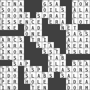 ACROSS 1. Inactive volcano in Sicily 5. Girls' org. (abbr.) 8. Pull behind 11. Within a short period 12. Petroleums 14. Insect wing 15. Marketplace scale 17. Small fatty European fish 18. Allow 19. Center 21. Epoch 22. Car dealer's back yard 23. Supplement with great effort 24. Male parent 25. Fish or hair follower 27. Single 28. Droops 31. Arches 35. Three (prefix) 37. Jai _ 38. "Two Mules for Sister ____" 39. R.R. building 41. Peachy ____! 42. Image 43. Fast jet (abbr.) 45. Capri or Wright 46. Repose 47. Bar bill 49. Plant excrement 51. Biblical high priest 52. Ocean 55. The 23rd letter of the Hebrew alphabet 57. Cleo's killer 60. Thinks logically 62. Wedding promise 63. Thick slices 65. Table seasonings 66. For each 67. Hollow 68. It may be bright or harebrained 69. Indiana (abbr.) 70. Nine, plus one 71. Dormintory (informal) DOWN 1. First name in cosmetics 2. Cod relative 3. Trap for birds or small mammals 4. Queen of England 1702-14 5. Grand Old Party 6. The founder of a family 7. Having or resembling wings 8. Baron Munchausen's specialties 9. Butter sub 10. Electrical Unit 13. Comedian Laurel of Laurel & Hardy 16. Inside; within (prefix) 17. Spring feasts 20. Patter 26. 1973 Nobel Price Winner (Physics) Leo 29. Highlander 30. Trig term 31. SW Saudi Arabia district 32. Libertine 33. What you're doing now 34. Before Barbara or Clara 36. ___ a Wonderful Life 40. Michaelmas daisies 44. Story 48. Prejudice 50. Romantic infatuation 52. Twentieth part of a lira 53. Keyboard key 54. Indian state 55. Native american tent (variation) 56. Arabian gulf 58. Notch 59. Diluted with white 61. Expressed in words 64. Benjamin's nick name