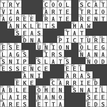 ACROSS 1. Attempt 4. Calm and collected 8. Leave at once 12. By way of 13. Johnson of "Laugh-In" 14. Musical group of three 15. Match 18. Pace 19. Monthly bill 20. Short socks 22. Opening into something insatiable 23. Oceans 24. Make lace 25. Heredity factor (abbr.) 26. Photo 30. Compass dir. 33. The state of being joined or united 36. Cassini of fashion 37. Straggles 39. Big collection agency 40. Nanny 41. Sever or remove by pinching or nipping 42. Narrow boards 44. Lower and raise head in agreement 45. Core 47. Snakelike fish 50. Black tropical American cuckoo 51. Caspian sea tributary 53. Make supply last 54. Borne 57. Competent 59. Sign of things to come 61. Slow-paced one 63. Den 64. Billionth: prefix 65. Perceive with the eye 66. Ancient Greek god of war 67. Singer James 68. Begley and Asner DOWN 1. Federal power corp. 2. Capital of Latvia 3. Entertaining tales 4. Haul 5. Mouths or openings 6. Baseball player Mel 7. Area sheltered from the wind 8. Ski resort town in Vermont 9. Ship's personnel 10. The 18th letter of the Arabic alphabet 11. Small child 16. Supplemented with great effort 17. Style 21. He sold his birthright 22. Apple computer (short form) 24. Shallow baking pan 26. Mail 27. ____ Bator 28. Former U.S. Attorney General Janet 29. Mild oath 30. Otherwise 31. Without 32. Armor plate that protects the chest 34. Mediterranean tributary 35. Lyricist Gershwin 38. Orators 42. _-fi 43. Wither 46. Compass dir. 48. Blunders 49. (Had) reclined 52. Gospel singer Marvin 53. Writer Wiesel 54. Penny 55. Small Philippine buffalo 56. Passed on 57. Wing 58. Soap unit 59. Single 60. Floor covering 62. French article