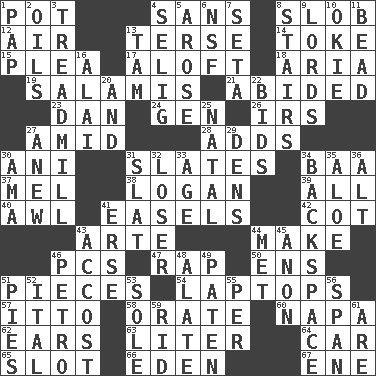 ACROSS 1. Plant holder 4. Without 8. Messy guy 12. Wind 13. Laconic 14. Casino tip 15. Entreaty 17. At or to great height 18. Roberta Peters solo 19. Deli grouping 21. Tolerated 23. Daniel's nick name 24. Commissioned mil. rank 26. Big collection agency 27. Among 28. Sums up 30. Black tropical American cuckoo 31. Chalkboards 34. Sound made by sheep 37. Cartoonist voice _ Blanc 38. Utah city north of Ogden 39. Everything 40. Leather borer 41. Artist's stands 42. Small bed 43. Johnson of "Laugh-In" 44. Cause to be 46. Personal Computers (abbr.) 47. Strike 50. Followers of ems 51. Parts 54. Portable computers 57. "Tell ____ the Marines!" 58. Speak pompously 60. California wine valley 62. Hearing organs 63. 61 cubic inches 64. Automobile 65. Groove 66. Paradise 67. Compass dir. DOWN 1. Infant food 2. Lubricates 3. Excercise machine 4. Former Milwaukee Brewers owner Bud 5. Came up 6. Overdraft (abbr.) 7. Stalk of a moss capsule 8. Flight of steps 9. Domineers 10. Migrant worker of the '30s 11. Necklace unit 13. Scottish cap 16. Jai ____ 20. Added to 22. Auction offers 25. Brizilian seaport 27. Afresh 29. Lairs 30. Wet nurse (var.) 31. Narrow board 32. Failure 33. Grow older 34. Keyboard key 35. _ vera 36. The first octave above the treble staff 41. Celtic language 43. Buttonhole 44. Was introduced to 45. At once, immediately (arch.) 46. Stone: prefix 48. Having winglike extensions 49. Eucharist need 51. Sliced desserts 52. Slanted text style (abbr.) 53. Not divided or shared with others 55. For each 56. Connect, as a bridge 59. To free from 61. "We ___ not amused" (Victoria)