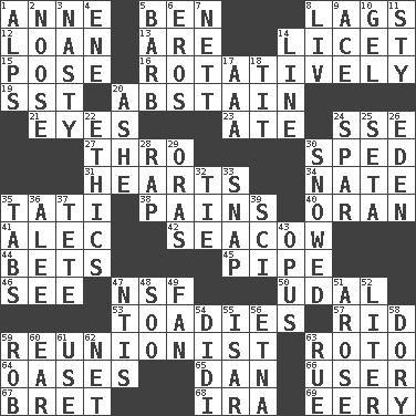 ACROSS 1. Queen of England 1702-14 5. Benjamin's nick name 8. Straggles 12. Grant temporary use of 13. "We ___ not amused" (Victoria) 14. It is permitted: Lat. 15. Introduce or present, as a question 16. Producing rotation 19. Fast jet (abbr.) 20. Refrain by choice 21. Snake ____ (dice throw) 23. Had dinner 24. Compass dir. 27. Through, poetically 30. Moved rapidly 31. Centers 34. Nathan's nickname 35. Jacques of French films 38. Aches 40. NW Algerian seaport 41. Actor Baldwin 42. Manatee 44. Wagers 45. Corncob 46. Observe 47. Science/research agcy. 50. Hereditary estate 53. Sycophants 57. To free from 59. One who advocates reunion 63. Printing process, for short 64. Fertile tracts in a desert 65. One of the 12 tribes of Israel 66. One who makes use of a thing 67. Cy Young winner Saberhagen 68. Lyricist Gershwin 69. Suggestive of the supernatural DOWN 1. High mountains 2. Trap for birds or small mammals 3. Difficult 4. Compass dir. 5. Sharp remark 6. Greek god of love 7. Remaining after all deductions 8. 54 in ancient Rome 9. Adept person 10. Set 11. Filthy place 14. Actor's bit 17. Auto club (abbr.) 18. Teat (slang) 20. American tennis player Robert 22. Moral principles 24. Coast Guard woman 25. Bristle 26. Locale of original sin 28. Reproach for some lapse or misdeed 29. Mouths or openings 30. Frozen precipiation fell 32. Neckwear 33. Fastener 35. Bar bills 36. Toward shelter 37. False hair 39. _-fi 43. Musical composition 47. Nuclear Threat Initiatives 48. "Barney Miller" actor Jack 49. Air blower 51. Came up 52. 61 cubic inches 54. "You Light Up My Life" star Conn 55. Austrian river, tributary to the Danube 56. Inactive volcano in Sicily 58. Small, narrow, flatbottom fishing boat 59. Director Reiner 60. Hearing organ 61. Purpose 62. Fish or hair follower 63. Regret