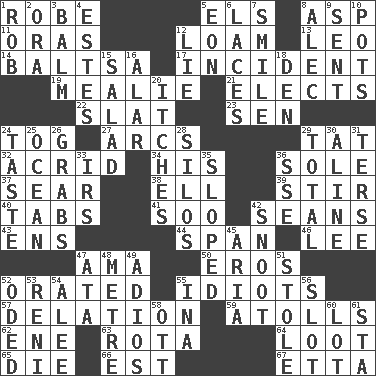 ACROSS 1. Loose flowing garment 5. Raised railways 8. Viper 11. Mouths or openings 12. Rich soil 13. Lion 14. Greek mezzo-soprano Agnes 17. Event 19. Ear of corn 21. Chooses 22. Narrow board 23. Elected rep. 24. Coat; cloak 27. Curves 29. Make lace 32. Bitter 34. Part of HMS, perhaps 36. Flatfish 37. Burn superficially 38. Pipe bend 39. Use a spoon 40. Bar bills 41. "Barney Miller" actor Jack 42. Actors Connery and Penn 43. Followers of ems 44. Connect, as a bridge 46. Area sheltered from the wind 47. Nursemaid (var.) 50. Greek god of love 52. Declaimed 55. Foolish or stupid persons 57. Accusation by an informer 59. Ringlike coral islands and reefs 62. Compass dir. 63. Round or rotation of duties 64. Spoils 65. Pass on 66. Eastern Standard Time (abbr.) 67. Singer James DOWN 1. Director Reiner 2. Mouth or opening 3. Lip ointment 4. _____ Park, CO 5. Age 6. Shoestrings 7. Grin 8. Actor Baldwin 9. Emitted 10. Plant holders 12. Whopper 15. Vegetable dish 16. Having or resembling wings 18. Lair 20. Irritating cutaneous sensations 24. Clothes sense 25. Sea 26. Seizes 28. Grain storage towers 29. "_____ Recall" 30. Place in a line 31. Laconic 33. Big collection agency 35. Slanted 36. Compass dir. 42. Snob 45. Operatic vocal solo 47. _ moment's notice (2 wds.) 48. Distance measurement (Brit.) 49. Goodbye (Sp.) 51. Fur scarf 52. Wrote a lyric poem 53. Painter Guido (1575-1642) 54. Toward shelter 55. _ tizzy (2 wds.) 56. Slit 58. Baseball player Mel 60. Car dealer's back yard 61. R.R. building