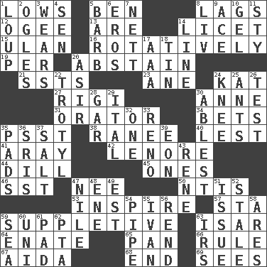 ACROSS 1. Moos 5. Benjamin's nick name 8. Fails to keep up a pace 12. Double curve, resembling the letter S 13. "We ___ not amused" (Victoria) 14. It is permitted: Lat. 15. Uhlan (variant) 16. Happening in regular succession 19. For each 20. Choose not to consume 21. Fast planes 23. One (Scot) 24. Krazy ___ of comics 27. Swiss mountan, "Queen of the Mountains" 30. Singer Murray 31. Speaker 34. Antes 35. Inconspicuous attention getter 38. Indian princess (variant) 40. For fear that 41. Like ___ of sunshine 42. Poe poem 44. Deli pickle 45. Singles 46. Fast jet (abbr.) 47. Born 50. Nuclear Threat Initiatives 53. Motivate 57. R.R. building 59. Supplying deficiencies 63. Austrian river, tributary to the Danube 64. Maternal 65. Baking dish 66. General guideline 67. Opera by Verdi 68. Conclusion 69. Perceives with the eye DOWN 1. Central Nebraska county 2. Stares at amorously 3. Erodes 4. Elected rep. 5. Sharp remark 6. Greek god of love 7. Remaining after all deductions 8. 54 in ancient Rome 9. Adept person 10. Set 11. Filthy place 14. Actor's bit 17. American Automobile Association (abbr.) 18. Shallow baking pan 20. SW Saudi Arabia district 22. Trinitrotoluene 24. Leg joint 25. Pismires 26. Trial 28. Slender fish 29. Slanted text style (abbr.) 30. Most capable 32. Single 33. Former U.S. Attorney General Janet 35. Groovy apts. 36. Indian titles of respect 37. Table seasoning 39. A really long time 43. French philosopher Descartes 47. "Death on the ____" 48. Compass dir. 49. Eastern Standard Time (abbr.) 51. Come out of 52. Lacking originality or spontaneity 54. Corncob 55. _ the terrible 56. Tear apart 58. Ancient Greek god of war 59. Ocean 60. University (slang) 61. Writing tablet 62. Parent Teacher Association (abbr.) 63. Big collection agency