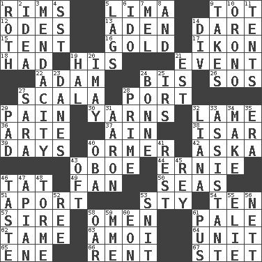 ACROSS 1. Basketball hoops 5. Pale green bean 9. Small child 12. Lyric poems 13. An important port of Yemen 14. Have the gumption 15. Portable shelter 16. Aureate 17. Visual representation of an object 18. Possessed 19. Part of HMS, perhaps 21. Incident 22. First of billions? 24. Again 26. Mayday 27. Any of the three canals of the cochlea 28. Left side of a ship or aircraft 29. Ache 30. Entertaining tales 32. Unable to walk 36. Johnson of "Laugh-In" 37. The 18th letter of the Arabic alphabet 38. Austrian river, tributary to the Danube 39. 24-hour periods 40. Abalone 42. "____ silly question..." 43. Mitch Miller's instrument 44. Bert's buddy 46. Make lace 49. Air blower 50. Oceans 51. To the left, to Queeg 53. Filthy place 54. "___ Little Indians" 57. Male parent of an animal 58. Sign of things to come 61. Light colored 62. Not wild 63. Mine, in Marseilles 64. A single undivided whole 65. Compass dir. 66. Monthly bill 67. Proofreading order DOWN 1. Writer of Portnoy's Complaint (1969) 2. It may be bright or harebrained 3. Ananias' fault 4. Fast jet (abbr.) 5. Straggles 6. Wedding promise 7. Cartoonist voice _ Blanc 8. Also 9. Receives possession of 10. U. of Maine site 11. Portable shelters 14. HTML Container Element 19. Actor Linden 20. "If ____ say so..." 21. Eastern Standard Time (abbr.) 23. Natives or inhabitants of Denmark 24. Maid-servant 25. Big collection agency 27. "Two Mules for Sister ____" 28. First class 29. Writing tablet 31. Composer Copland 32. Woody, climbing, usually tropical plant 33. Helper 34. Create 35. Period 40. Chief or king in Benin or Nigeria 41. Take ten 43. Often (poetically) 45. Marina Del _, California 46. Clothes sense 47. Bee-related 48. Singer Mel 52. To sift 53. In a ____ (agitated or irritated) 55. Writer Wiesel 56. Remaining after all deductions 58. Rowing implement 59. Madame (abbr.) 60. Age 61. Ichor