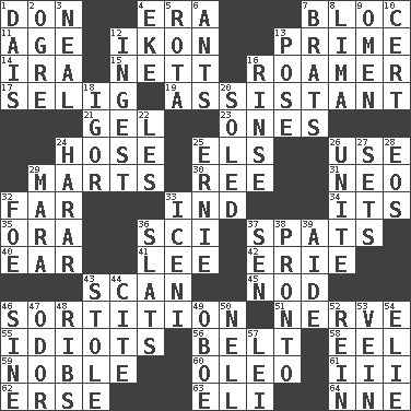 ACROSS 1. Spanish title 4. Period 7. Alliance 11. Personal question 12. Image 13. First class 14. Lyricist Gershwin 15. Remaining after all deductions 16. Wanderer 17. Major League Baseball Commissioner Bud 19. Helper 21. Set 23. Washington bills 24. Stockings 25. Raised railways 26. Purpose 29. Shops 30. To separate or throw off 31. Modern: prefix 32. Distant 33. Working for oneself (abbr.) 34. ___ a Wonderful Life 35. Mouth or opening 36. _-fi 37. Arguments over trivial matters 40. Ewer handle 41. Area sheltered from the wind 42. One of the Great Lakes 43. Examine minutely or intensely 45. Lower and raise head in agreement 46. Determination 51. Effrontery 55. Foolish or stupid persons 56. Waist strap 58. Snakelike fish 59. Impressive in appearance 60. Butter sub 61. One more than two 62. Celtic language 63. Connecticut Ivy Leaguer 64. Compass dir. DOWN 1. Raised platform 2. Legendary monster 3. Be tempered by heat 4. Make supply last 5. Roll call or roster of names 6. Pismires 7. Naughty children 8. Pale green bean 9. Presage 10. Certainty 12. Swallow 13. Airs 16. Remove soap 18. Russian composer Stravinsky 20. Having a sole or soles 22. French article 24. Ethiopian city, capital of Harari 25. Bert's buddy 26. Join together 27. Puts into a specified state 28. Greek goddess of the dawn 29. Hindu Mythology: god of death 32. Enemy 33. Ancient Celtic tribe of eastern Britain 36. Narrow boards 37. Elected rep. 38. Right away 39. Assistant 43. Fur scarf 44. Quote 46. Trig term 47. Scent 48. Teases 49. Mitch Miller's instrument 50. 1994 drama film starring Jodie Foster 52. It's straight from the horse's mouth 53. Distinctive style or manner 54. Writer Wiesel 57. Flowery wreath