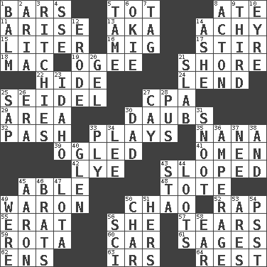 ACROSS 1. Drinking establishments 5. Small child 8. Had dinner 11. Originate 13. Alias (abbr.) 14. Painful 15. 61 cubic inches 16. Russian fighter aircraft 17. Move through with a circular motion 18. Big _ 19. Double curve, resembling the letter S 21. Dinah or Pauly 22. Flintstone garb 24. Grant temporary use of 25. Beer mug 27. Tax preparer (abbr.) 29. Type of rug 30. Applies to a surface 32. Romantic infatuation 33. Live dramatic performances 35. Nanny 39. Stared at amorously 41. Presage 42. Potassium hydroxide 43. Slanted 45. Competent 48. Carryall 49. Make _____ (do battle with) 50. US Secretary of Labor Elaine L. _ 52. Hit sharply and swiftly 55. Part of Q.E.F. 56. A female animal or person 57. Pulls into pieces 59. Roll call or roster of names 60. Auto 61. Gurus 62. Followers of ems 63. Big collection agency 64. Relief DOWN 1. Lip ointment 2. Roberta Peters solo 3. Actors Guy, Robert Welles, and Clint 4. Compass dir. 5. Not wild 6. Migrant worker of the '30s 7. Label 8. Gambison 9. One of three equal parts 10. Jane of fiction 12. Eat (away) 14. American tennis player Robert 20. Set 21. Broad, flat, thick piece 23. Potato state 25. Plant excrement 26. Epoch 27. Island 28. Tenth month of the Hindu calendar 30. Male parent 31. Snout, nose 33. Travel a route regularly 34. Area sheltered from the wind 36. Electrical Measurement 37. Born 38. Plus 40. Small, secluded valley 43. R.R. building 44. Plunders 45. Composer Copland 46. Naughty children 47. Globular water bottle used in Asia 49. Past tense of be (plural) 50. Burn to charcoal 51. Possessive pronoun 53. Ancient Greek god of war 54. Inconspicuous attention getter 56. _-fi 58. Hearing organ