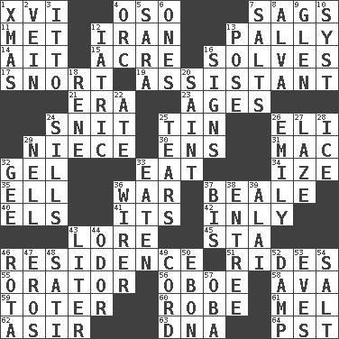 ACROSS 1. 16 4. Bear (Spanish) 7. Droops 11. Was introduced to 12. SW Asia republic 13. Chummy 14. Small island 15. Land measure 16. Finds the solution 17. Derisive sound 19. Aide 21. Period 23. Ripens 24. In a ____ (agitated or irritated) 25. Shallow baking pan 26. Connecticut Ivy Leaguer 29. Sibling's daughter 30. Followers of ems 31. Apple computer (short form) 32. Set 33. Erode 34. Ending with capital 35. Pipe bend 36. Armed conflict 37. Calif. Air Force Base 40. Raised railways 41. It is 42. Inwardly 43. Old wives' tales, e.g. 45. R.R. building 46. Dwelling 51. Amusement-park features 55. Speaker 56. Mitch Miller's instrument 58. Actress Gardner 59. Carrier 60. Loose flowing garment 61. Cartoonist voice _ Blanc 62. SW Saudi Arabia district 63. Heredity factor (abbr.) 64. Pacific Standard Time (abbr.) DOWN 1. Dec. holiday 2. Distinctive style or manner 3. "Tell ____ the Marines!" 4. The grampus (Milton) 5. "Two Mules for Sister ____" 6. Singles 7. Table seasonings 8. Inventor's middle name 9. Small, secluded valley 10. System (abbr.) 12. Of or pertaining to medicine 13. Airs 16. Public displays of written messages 18. French philosopher Descartes 20. Virtuous person 22. Had dinner 24. Beverly of Met fame 25. Rends 26. Poet Dickinson 27. Goldbrick 28. Frozen water 29. 1994 drama film starring Jodie Foster 32. Turn to the right 33. Consumed 36. One who wires 37. Again 38. Main course 39. Mountain range southwest of Kyrgyzstan 43. 61 cubic inches 44. Scent 46. Round or rotation of duties 47. Greek god of love 48. Suttee (variant) 49. Drawstring 50. Inky black, to poets 52. Moist 53. Nights before holidays 54. Table seasoning 57. Chief or king in Benin or Nigeria