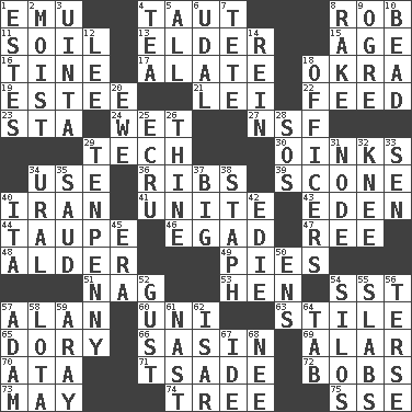 ACROSS 1. Australian flightless bird 4. Pulled tight 8. Director Reiner 11. Earth 13. A person who is older than you are 15. Grow older 16. Prong on a fork 17. Having winglike extensions 18. Gumbo ingredient 19. First name in cosmetics 21. Flowery wreath 22. Nourish 23. R.R. building 24. Dripping 27. Science/research agcy. 29. Technical 30. Pig sounds 34. Purpose 36. Chest bones 39. Biscuitlike quick bread 40. SW Asia republic 41. Join together 43. Genesis locale 44. Grayish beige 46. Mild oath 47. Portuguese money of account (variant) 48. Tree or shrub in the Birch family 49. Sliced desserts 51. Tired old horse 53. Layer 54. Fast jet (abbr.) 57. Actor Alda or Thicke 60. University (slang) 63. Vertical member of a panel or frame 65. Dinghy 66. Indian antelope 69. Having or resembling wings 70. "One Day ___ Time" 71. Sadhe (variant) 72. Moves up and down 73. Can I? 74. Family _ (genealogy) 75. Compass dir. DOWN 1. _____ Park, CO 2. Damp 3. National forest in Provo, Utah 4. Afternoon social gathering 5. Everything 6. Freehold land 7. False hair 8. Immoral or dissolute person 9. Legendary monster 10. Necklace unit 12. Area sheltered from the wind 14. It's straight from the horse's mouth 18. Persons of authority 20. She-sheep 25. Shade of tan 26. One or ones belonging to thee 28. Mayday 29. 3-inch nail 31. Thickened enlargement 32. Leg joint 33. Elected rep. 34. Mountain range 35. Saudi Arabian king (1953-1964) 37. Of large size 38. Staphylococcus 40. Call ___ day 42. Singer Brickell 45. Period 50. Followers of ems 52. Abrupt rush of wind 54. Grain storage towers 55. Thick slices 56. Laconic 57. First man 58. Globular water bottle used in Asia 59. Like ___ of sunshine 61. Political cartoonist Thomas 62. Austrian river, tributary to the Danube 64. Keyboard key 67. Binary compound 68. Born