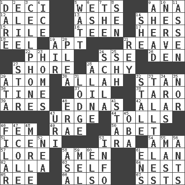 ACROSS 1. Tenth: prefix 5. Moistens 9. Santa ___, CA 12. Actor Baldwin 13. American tennis player Robert 14. "______ My Girl" (Turtles hit) 15. Cause heat under the collar 16. Adolescent 17. Possessive pronoun 18. Snakelike fish 19. Fitting 21. Break or tear apart 22. Silvers or Donahue 24. Compass dir. 26. Lair 27. Dinah or Pauly 28. Painful 29. Tiny particle 30. Assad's deity 32. Comedian Laurel of Laurel & Hardy 36. Prong on a fork 37. Petroleum 38. Edible starchy tuberous root 39. Ancient Greek god of war 40. Ferber et al. 42. Having or resembling wings 43. Goad 44. For Whom the Bell _____ 46. Opposite of masc. 49. Actress Charlotte 50. Collude with 51. Ancient Celtic tribe of eastern Britain 53. Retirement account (abbr.) 54. Housemaid (var.) 57. Old wives' tales, e.g. 58. So be it 61. Style 62. Silent film actress Nazimova 63. Automatically 64. A home for chicks 65. To separate or throw off 66. In addition 67. Fast planes DOWN 1. Have the gumption 2. Writer Wiesel 3. Portable communications device 4. Frozen water 5. Electrical Unit 6. Compass dir. 7. Definite Article 8. Elected rep. 9. Forward in time 10. Boldness 11. NE Netherlands city 14. A female animal or person 19. Wind 20. Entreaty 21. Marina Del _, California 23. Dwellings 24. Any of the three canals of the cochlea 25. Quiet! 27. Disorderly outburst 28. Place in a line 29. "One Day ___ Time" 31. Inn 32. Having lost freshness 33. Baron Munchausen's specialties 34. Ancient river in northeast Turkey 35. Not either 40. Epoch 41. Play the lead 43. RI univ. 45. Chief or king in Benin or Nigeria 46. Of or pertaining to a thread or threads 47. Learning spot: Fr. 48. Haggard of country music 52. Teachers' org. 53. Information 55. Vertical spar for supporting sails 56. Pismires 58. White ___ sheet 59. Cartoonist voice _ Blanc 60. Raised railways 61. Followers of ems