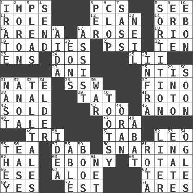 ACROSS 1. Naughty children 5. Personal Computers (abbr.) 8. Perceive with the eye 11. Hero or heavy, e.g. 12. Flair 14. Globe 15. Sports stadium 17. Came up 18. _ de Janeiro 19. Sycophants 21. Air pressure measure (abbr.) 22. "___ Little Indians" 23. Followers of ems 24. Two (Sp.) 25. Cards in a Roman deck? 27. Cuckoo 28. Nuclear Threat Initiatives 31. Nathan's nickname 35. Compass dir. 37. A pale, very dry sherry 38. Of or related to the anus 39. Make lace 41. Printing process, for short 42. Disposed of to a purchaser 43. Friend of Pooh 45. Soon (poet.) 46. Falsehood 47. Mouth or opening 49. Three (prefix) 51. Bar bill 52. Lion 55. Beverage made from leaves 57. Apply (a substance) by light strokes 60. Catching in a trap 62. Actor Linden 63. Black 65. "_____ Recall" 66. Compass dir. 67. Medicinal plant 68. Wig 69. It is so 70. Eastern Standard Time (abbr.) 71. Ancient Greek god of war DOWN 1. Feeling or showing extreme anger 2. Person of subnormal intelligence 3. Entreaties 4. Post 5. For each 6. Hoof sound 7. Backtalk 8. Drawing lots 9. 4th largest of the Great Lakes 10. Inky black, to poets 13. Famous astronaut Armstrong 16. Opera by Verdi 17. Help 20. Immeasurably long periods of time 26. Kind of red light 29. To the inside or interior of 30. Within a short period 31. Political cartoonist Thomas 32. Small Philippine buffalo 33. Baron Munchausen's specialties 34. A person who is older than you are 36. Armed conflict 40. A girl or young woman (variant) 44. NW Algerian seaport 48. Blind as ____ 50. The main thing one is thinking about 52. 61 cubic inches 53. Maternal 54. Stares 55. Those people 56. Comfort 58. Competent 59. Expressions of contempt or scorn 61. Roll call or roster of names 64. Fish or hair follower