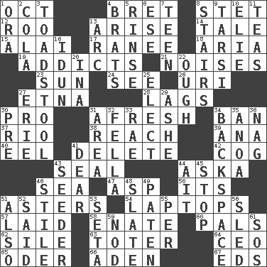 ACROSS 1. Sep. follower 4. Cy Young winner Saberhagen 8. Proofreading order 12. Friend of Pooh 13. Originate 14. Falsehood 15. Mountain range southwest of Kyrgyzstan 17. The wife of a rajah (variant) 18. Roberta Peters solo 19. Inveterate users 21. Annoying sounds 23. Player for Phoenix 24. Perceive with the eye 26. RI univ. 27. Inactive volcano in Sicily 28. Fails to keep up a pace 30. Adept person 31. Anew 34. Forbid 37. _ de Janeiro 38. Arrive at 39. Santa ___, CA 40. Snakelike fish 41. Erase 42. Gear tooth 43. Lick closed 44. "____ silly question..." 46. Ocean 47. Viper 50. It is 51. Michaelmas daisies 54. Portable computers 57. Put down 58. Maternal 60. Friends 62. Filth; sediment 63. Carrier 64. Corporate head (abbr.) 65. River in Europe 66. An important port of Yemen 67. Begley and Asner DOWN 1. Mouth or opening 2. Root beer relative 3. Inedible or poisonous agaric 4. Naughty children 5. Remove soap 6. Compass dir. 7. Adolescent 8. Flight of steps 9. Tarsus (plural) 10. Writer Wiesel 11. Beverages made from leaves 13. Curve 16. Goddess of spring and wife of Bragi 20. _ tizzy (2 wds.) 22. Ending for "Through" and "Enough" 25. Choose 27. One of the Great Lakes 29. American tennis player Robert 30. Before (prefix) 31. Length times width 32. Man or boy (slang) 33. Actress Charlotte 34. Keyboard key 35. Small Philippine buffalo 36. Tired old horse 41. Letter starter 43. Sowing specialist 44. Small island 45. Halt 46. Vertical member of a panel or frame 48. Chalkboard 49. Eucharist need 51. In addition 52. Stated 53. Stalk of a moss capsule 55. For each 56. Downhill vehicle 59. Lower and raise head in agreement 61. Distress signal