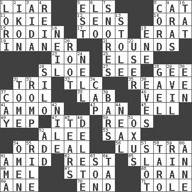 ACROSS 1. One who doesn't tell the truth 5. Raised railways 8. Feline 11. Migrant worker of the '30s 12. Elected reps. 14. Mouth or opening 15. "The Thinker" sculptor 17. A blast of a horn 18. Part of Q.E.F. 19. More empty; more void 21. Periods in a boxing match 23. Electrically charged atom 25. Otherwise 26. _ gin 27. Observe 28. Unit of force equal to gravity 31. Three (prefix) 33. Affectionate concern, for short 35. Rob, plunder, or pillage 37. Calm and collected 38. Experiment locale 40. Distinctive style or manner 41. ID or VA city 43. Baking dish 45. Pipe bend 46. Slangy assent 47. It would 50. Vintage cars 52. Toward shelter 53. Saxophone 54. Severe or trying experience 56. A period of five years 61. Among 62. Repose 65. Killed 66. Cartoonist voice _ Blanc 67. Portico 68. NW Algerian seaport 69. A saturated hydrocarbon 70. Conclude 71. Lacquered or enameled metalware DOWN 1. Australian parrot (variant) 2. Picture 3. Opera by Verdi 4. It's straight from the horse's mouth 5. Eastern Standard Time (abbr.) 6. Lion 7. Sounds asleep 8. Drawstring 9. Caspian sea tributary 10. Make lace 13. Took without asking 16. Famous astronaut Armstrong 18. Compass dir. 20. Carrot, for example 22. One who uses or employs something 24. 1994 drama film starring Jodie Foster 26. Grain storage tower 28. Highlander 29. Tending to cause great harm 30. Car or cant ending 31. Heavy book 32. Play 34. Head covering 36. Nights before holidays 37. Island 39. Taverns 42. The longest river in the world 44. Be tempered by heat 48. Lacerates 49. Erase 51. Amu Darya 52. Find the sum of 54. Sign of things to come 55. Cause heat under the collar 57. Narrow opening 58. Pacific island yam 59. Monetary unit of Yemen 60. Singer Murray 61. Nanny (var.) 63. Boy, to dad 64. Small amount or degree