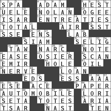 ACROSS 1. Health resort 4. First of billions? 8. Behest 12. Ubangi River tributary 14. Pitcher Ryan 16. Double curve, resembling the letter S 17. Austrian river, tributary to the Danube 18. Pleas 20. "_____ Recall" 22. Wind 23. Fast jet (abbr.) 24. Compass dir. 25. Followers of ems 28. Experiment locale 30. Thailand, formerly 31. Major League Baseball Commissioner Bud 35. The 23rd letter of the Hebrew alphabet 37. Drug cop 40. Make mention of 41. Relaxation 42. Flexible twig of a willow tree 44. Glance over 45. Arab leader 46. Hollow 47. Petroleum 48. Impudent aggressiveness 50. Grant temporary use of 52. Begley and Asner 54. Double-curved letter 55. Auto club (abbr.) 58. Compass dir. 61. Adept person 63. Some stationery 65. Car 70. Australian parrot (variant) 71. Stalk of a moss capsule 72. Hauls 73. Roberta Peters solo 74. Russian ruler of old 75. Political cartoonist Thomas 76. Nine, plus one DOWN 1. Sets or collections 2. Mexican monetary units 3. Having winglike extensions 4. A saturated hydrocarbon 5. Spanish title 6. The first octave above the treble staff 7. Hindu Mythology: god of death 8. Being at a high temperature 9. Armor plate that protects the chest 10. Perceives with the eye 11. Trial 13. Period 15. Famous astronaut Armstrong 19. Caspian sea tributary 21. Luau accessory 26. Billionth: prefix 27. Box-office sellout 29. Gillaume's butler role 30. Turn aside suddenly 32. Locales 33. Slanted text style (abbr.) 34. Commissioned mil. rank 35. Docile 36. SW Saudi Arabia district 38. _ de Janeiro 39. Cell (Danish) 41. Car or cant ending 43. Vintage cars 49. Dutch treat 51. Viper 53. Highlander 55. To the left, to Queeg 56. Nest on high 57. Believer in; advocate of (suffix) 58. Compass direction 59. Takes to court 60. Singer James 62. Inky black, to poets 64. In the manner of 66. Boat paddle 67. Call ___ day 68. French article 69. Eastern Standard Time (abbr.)