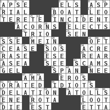ACROSS 1. Domed church section 5. Raised railways 8. Viper 11. Monetary unit of Yemen 12. Water vessel 13. Lion 14. Cigar-shaped 17. Happening 19. Oak nuts 21. Chooses 22. Musical group of three 23. Elected rep. 24. Compass dir. 27. Chow _ 29. Often (poetically) 32. Desist 34. Mayday 36. Measure of real estate 37. Raze (variant) 38. Compass dir. 39. Rump 40. Toward the sea 41. Observe 42. Fraudulent business schemes 43. Set 44. Connect, as a bridge 46. Born 47. Nanny (var.) 50. Greek god of love 52. Spoke pompously 55. Foolish or stupid persons 57. Accusation by an informer 59. Ringlike coral islands and reefs 62. Compass dir. 63. Roll call or roster of names 64. Spoils 65. Pass on 66. Eastern Standard Time (abbr.) 67. Singer James DOWN 1. Nonscientific branch of learning 2. Sliced dessert 3. "Two Mules for Sister ____" 4. Voters do this 5. Period of immesurable duration 6. Shoestrings 7. Vertical member of a panel or frame 8. Actor Baldwin 9. Posted 10. Cooking vessels 12. Twice 15. Singer Mel 16. 4th largest of the Great Lakes 18. Lair 20. Annoying sounds 24. Strangle with an iron collar 25. Gospel singer Marvin 26. Artist's stand 28. Olfactory organs 29. Sea 30. Movie unit 31. Laconic 33. Ocean 35. Oozed 36. Curve 42. Snout, nose 45. Roberta Peters solo 47. _ moment's notice (2 wds.) 48. Distance measurement (Brit.) 49. Goodbye (Sp.) 51. Took without asking 52. Wrote a lyric poem 53. Painter Guido (1575-1642) 54. Toward shelter 55. _ tizzy (2 wds.) 56. Slit 58. Baseball player Mel 60. Car dealer's back yard 61. R.R. building