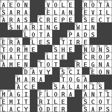 ACROSS 1. Period of immesurable duration 5. Grand slam 9. Round or rotation of duties 13. "Two Mules for Sister ____" 14. Enthusiasm 15. Morally bad or wrong 16. Caspian sea tributary 17. Streamer paper 18. Religious group 19. Catching in a trap 21. Acquire through effort 22. Globular water bottle used in Asia 23. Groovy apts. 24. Period 27. French article 28. Become fatigued 29. Singer Mel 31. A female animal or person 32. Religious women 36. Nathan's nickname 37. Whopper 38. Riding implement 39. So be it 40. Small child 41. Rain (Swedish) 42. _ Jones' Locker 44. _-fi 46. A really long time 47. Hindu Mythology: god of death 48. Ancient Roman robe 50. Adept person 51. Deli grouping 54. Wise men 56. Plants 58. Opposed to 60. Send forth 61. Cause heat under the collar 62. Highlander 63. Made of lace 64. Baltic tributary 65. Plant excrements DOWN 1. White ___ sheet 2. Hearing organs 3. NW Algerian seaport 4. Rhinal 5. Actresses Bloom and Felton 6. Cassini of fashion 7. Infant locale 8. Compass dir. 9. Dwelling 10. Baking chambers 11. Nervous spasm 12. Keyboard modifier key 17. Quote 20. Hero or heavy, e.g. 21. Armed conflict 23. Sliced dessert 24. Inactive volcano in Sicily 25. Wander aimlessly 26. Johnson of "Laugh-In" 28. Definite Article 30. Ananias' fault 31. Be seated 33. Goad 34. Words to Nanette 35. Connect, as a bridge 37. Myrna of the movies 40. Federal power corp. 41. Capital of Latvia 43. "We ___ not amused" (Victoria) 44. A viewer who gazes fixedly 45. Root beer relative 47. Mysterious quality of enchantment 49. Collect or gather 51. Flatfish 52. South American Indian 53. Cease 54. Cartoonist voice _ Blanc 55. Nursemaid (var.) 56. Away 57. Flaplike covering 59. It is