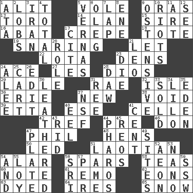 ACROSS 1. Came down and settled, as after flight 5. Short-tailed, large-bodied rat 9. Mouths or openings 13. "Corrida" creature 14. Style 15. Father 16. Blind as ____ 17. Streamer paper 18. Carry 19. Catching in a trap 21. Allow 22. Globular water bottle used in Asia 23. Lairs 24. Adept person 27. French article 28. "Vaya con ____" 29. Dipping utensil 31. Actress Charlotte 32. Capri or Wright 36. One of the Great Lakes 37. ___ Haven, CT 38. Null 39. Singer James 40. Compass dir. 41. Cell (Danish) 42. Not kosher 44. Before (prefix) 46. Spanish title 47. Silvers or Donahue 48. Coop moms 50. Directed 51. Of or relating to Laos or its people 54. Having or resembling wings 56. Practice fights 58. Beverages made from leaves 60. Brief written record 61. San ____ (Riviera town) 62. Immeasurably long periods of time 63. Colored 64. Angers 65. Overwhelm DOWN 1. _ moment's notice (2 wds.) 2. Tennis shots 3. SW Asia republic 4. Add up to 5. Actresses Bloom and Felton 6. Cassini of fashion 7. Infant locale 8. Compass dir. 9. Clearly or manifestly demonstrative 10. Debaucheries 11. Tate display 12. Perceive with the eye 17. Quote 20. Hero or heavy, e.g. 21. Lion 23. Pass on 24. Toward shelter 25. Heavy open wagon 26. Prepare for publication 28. Obsolete 30. Resembling or made to resemble leather 31. To separate or throw off 33. Exchanged or delivered for money 34. _ and Stitch 35. Paradise 37. Science/research agcy. 40. Snakelike fish 41. Penny 43. To free from 44. N Egypt peninsula 45. Vintage cars 47. Food holder 49. Settings 51. Unable to walk 52. Age 53. Billionth: prefix 54. Added to 55. Myrna of the movies 56. Indian title of respect (Mr.) 57. For each 59. Compass dir.
