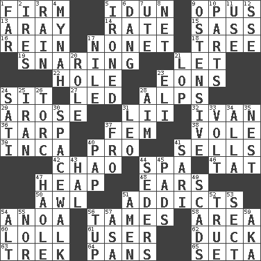 ACROSS 1. Not soft or yielding to pressure 5. Goddess of spring and wife of Bragi 9. Musical composition 13. Like ___ of sunshine 14. Pace 15. Backtalk 16. It's straight from the horse's mouth 17. Music written for nine 18. Family _ (genealogy) 19. Catching in a trap 21. Allow 22. Opening into or through something 23. Immeasurably long periods of time 24. Be seated 27. Directed 28. High mountains 29. Came up 31. Cards in a Roman deck? 32. _ the terrible 36. Canvas cover 37. Opposite of masc. 38. Short-tailed, large-bodied rat 39. South American Indian 40. Adept person 41. Exchanges for money 42. US Secretary of Labor Elaine L. _ 44. Health resort 46. Make lace 47. Pile 48. Hearing organs 50. Leather borer 51. Inveterate users 54. Small Philippine buffalo 56. Corrects by punishment or discipline 58. Length times width 60. Hang loosely or laxly 61. One who uses or employs something 62. Evade 63. Long journey 64. Baking dishes 65. Stalk of a moss capsule DOWN 1. Distant 2. Angers 3. Water falling in drops from the sky 4. Non-adult bird? 5. Pressed 6. Mild oath, euphamism for damn 7. Shoshoni 8. Fish or hair follower 9. Clearly or manifestly demonstrative 10. Pieces 11. Purpose 12. Compass dir. 17. "Death on the ____" 20. Hero or heavy, e.g. 21. Trim (branches) 23. Connecticut Ivy Leaguer 24. Suttee (variant) 25. SW Asia republic 26. Torque (variant) 28. Direct toward a target or goal 30. High altitude stroll 31. Lion 33. Electrical Unit 34. Silent film actress Nazimova 35. A home for chicks 37. Back 40. Infant food 41. Indian skirt 43. Actor Linden 44. Spring feasts 45. Groovy apts. 47. White Person, in Hawaii 49. Large numbers or amounts 51. So be it 52. Loyal 53. Religious group 54. Keyboard modifier key 55. And not 56. Uncastrated adult male sheep 57. White ___ sheet 59. Alias (abbr.)