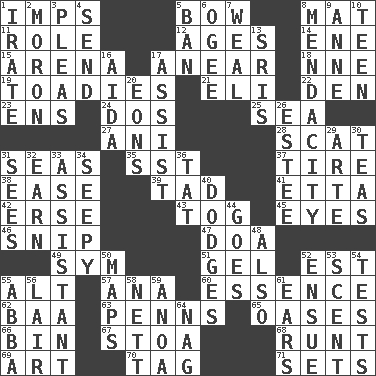 ACROSS 1. Naughty children 5. Ribbon knot 8. Floor covering 11. Hero or heavy, e.g. 12. Eras 14. Compass dir. 15. Sports stadium 17. Approach 18. Compass dir. 19. Sycophants 21. Connecticut Ivy Leaguer 22. Lair 23. Followers of ems 24. Two (Sp.) 25. Ocean 27. Black tropical American cuckoo 28. Go away! 31. Oceans 35. Fast jet (abbr.) 37. Hoop that covers a wheel 38. Comfort 39. Small boy 41. Singer James 42. Celtic language 43. Coat; cloak 45. Snake ____ (dice throw) 46. Sever or remove by pinching or nipping 47. ___ good deed 49. Symbol (abbr.) 51. Set 52. Eastern Standard Time (abbr.) 55. The first octave above the treble staff 57. Santa ___, CA 60. Core 62. Sound made by sheep 63. Actor Sean's family 65. Fertile tracts in a desert 66. Storage container 67. Portico 68. The smallest animal of a litter 69. Tate display 70. Label 71. Puts into a specified state DOWN 1. Feeling or showing extreme anger 2. Person of subnormal intelligence 3. Entreaties 4. Transmit 5. Prohibit 6. Double curve, resembling the letter S 7. Welt 8. Ananias' fault 9. Queen of England 1702-14 10. Adolescent 13. Indian titles of respect 16. Opera by Verdi 17. Help 20. Immeasurably long periods of time 26. First name in cosmetics 29. Johnson of "Laugh-In" 30. Beverages made from leaves 31. Observes 32. Merit 33. Helper 34. Not well drained, as in land 36. Make lace 40. Evades 44. Leaves 48. In addition 50. Atlas contents 52. Take place subsequently 53. Odor 54. Trials 55. Swedish rock group 56. Den 58. Remaining after all deductions 59. Small Philippine buffalo 61. Hearing organs 64. Tired old horse