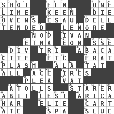 ACROSS 1. Guess 5. Shade tree 8. Single 11. Welles in "The Third Man" 12. Peachy ____! 14. Pass on 15. Baking chambers 17. He sold his birthright 18. Small valley 19. Watched over 21. Poe poem 23. Lower and raise head in agreement 25. "Terrible" tsar 26. Inactive volcano in Sicily 27. Age 28. Compass dir. 31. HTML Container Element 33. Three (prefix) 35. Phillipine bananalike plant 37. Quote 38. And so on (abbr.) 40. Part of Q.E.F. 41. Suffix with ecto or cyto 43. Insect wing 45. Make lace 46. Everything 47. Adept person 50. Angers 52. Entreaty 53. Large container 54. Ringlike coral islands and reefs 56. A viewer who gazes fixedly 61. "This won't hurt ____!" 62. For fear that 65. N. Chile seaport 66. Impair 67. Writer Wiesel 68. Draw slowly or heavily 69. Had dinner 70. Health resort 71. Turn sharply DOWN 1. Narrow, elongated depression 2. Hub of activity 3. Sign of things to come 4. Watch over 5. Supplement with great effort 6. French article 7. Ear of corn 8. River in Europe 9. Mediterranean tributary 10. Snakelike fish 13. New (sp.) 16. Transmitted 18. Spanish title 20. Do not 22. Grandmother 24. Have the gumption 26. Nights before holidays 28. "Two Mules for Sister ____" 29. Jazz singing style 30. Erode 31. Deli pickle 32. Slanted text style (abbr.) 34. Call ___ day 36. Antes 37. Accounting whiz (abbr.) 39. 154 in Roman numerals 42. Shopping center 44. Ancient river in northeast Turkey 48. Cell (Danish) 49. Artist's stands 51. Singer James 52. Plant holder 54. Blind as ____ 55. Become fatigued 57. Arches 58. Monetary unit of Yemen 59. Shade of tan 60. Assign a rank or rating to 61. Wet nurse (var.) 63. Small drink 64. Afternoon social gathering