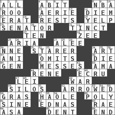 ACROSS 1. 100% 4. "This won't hurt ____!" 8. Basketball assoc. 11. Friend of Pooh 12. Nest on high 14. South Vietnam president (1954) 15. Part of Q.E.F. 17. Musical pauses 18. Sharp bark 19. Legislator 21. Tinged 23. "___ Little Indians" 24. Last letter of the English alphabet 25. Operatic vocal solo 27. Toward shelter 30. Compass dir. 31. A viewer who gazes fixedly 34. Nonscientific branch of learning 37. Cuckoo 38. Leaves out 39. Expire 40. Commissioned mil. rank 41. Makes clutter 43. Housemaid (var.) 44. French philosopher Descartes 45. Shade of tan 47. Flowery wreath 49. Armed conflict 50. Grain storage towers 52. Moved like an arrow 56. Pate de foie ____ 57. White Person, in Hawaii 60. Many (prefix) 61. Trig term 62. Ferber et al. 63. Actress Charlotte 64. White ___ sheet 65. Scratch 66. Conclusion DOWN 1. Ancient Greek god of war 2. Old wives' tales, e.g. 3. Grant temporary use of 4. Composer Copland 5. Fermented drink made from hops 6. Big collection agency 7. Teat (slang) 8. Sibling's daughter 9. Waist strap 10. Electrical Unit 13. Eastern Standard Time (abbr.) 14. Unit of force 16. Jacques of French films 20. Beverages made from leaves 22. Ending with capital 25. Queen of England 1702-14 26. It's straight from the horse's mouth 27. Originate 28. Allows 29. Celtic language 30. Tired old horse 32. Heavy book 33. So be it 34. The sixth month of the Jewish calendar 35. Tall New Zealand timber tree 36. Beverage made from leaves 42. Burn superficially 44. _ de Janeiro 46. Riding implement 47. Woody, climbing, usually tropical plant 48. Otherwise 49. Take or capture by force 50. Indian titles of respect 51. A female animal or person 52. Actor Alda or Thicke 53. Had on 54. Style 55. Colored 56. Girls' org. (abbr.) 58. Find the sum of 59. Single