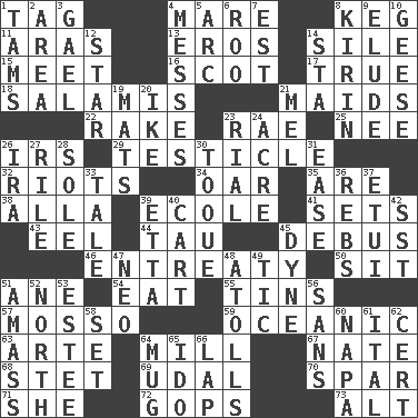 ACROSS 1. Label 4. Female horse 8. Barrel 11. Caspian sea tributary 13. Greek god of love 14. Drop; flow; fall 15. Confront 16. Highlander 17. Loyal 18. Deli grouping 21. Unmarried girls 22. Immoral or dissolute person 23. Actress Charlotte 25. Born 26. Big collection agency 29. One of the two male reproductive glands 32. Debaucheries 34. Rowing implement 35. "We ___ not amused" (Victoria) 38. Silent film actress Nazimova 39. Learning spot: Fr. 41. Puts into a specified state 43. Snakelike fish 44. The 19th letter of the Greek alphabet 45. To get out of a bus 46. Plea 50. Be seated 51. One (Scot) 54. Ingest 55. Canisters 57. With motion or animation 59. Pertaining to the sea 63. Johnson of "Laugh-In" 64. Place where flour is made 67. Nathan's nickname 68. Proofreading order 69. Freehold land 70. Practice fight 71. A female animal or person 72. Republicans 73. Keyboard modifier key DOWN 1. Scottish caps 2. Length times width 3. Highlander 4. Makes clutter 5. Curve 6. Friend of Pooh 7. Eastern Standard Time (abbr.) 8. Japanese brewing company 9. Dodge 10. Honkers 12. Play the lead 14. R.R. building 19. Floor protectors 20. Eisenhower's nickname 21. Cartoonist voice _ Blanc 23. Monetary unit of Yemen 24. 1/640 square mile 26. Retirement account (abbr.) 27. Cause heat under the collar 28. Flatfish 30. Woman's close-fitting hat 31. Relaxation 33. Story 36. Confederate soldiers (slang) 37. Needle case 39. Singer James 40. Haul 42. Fast jet (abbr.) 45. Centimeter-gram-second unit of force 47. Modern: prefix 48. Ringlike coral islands and reefs 49. Nervous spasm 51. Collect or gather 52. Compass direction 53. First name in cosmetics 56. Without 58. Arrange properly for use 60. California wine valley 61. Slanted text style (abbr.) 62. Sure thing 64. Java container 65. Wedding promise 66. Infant locale