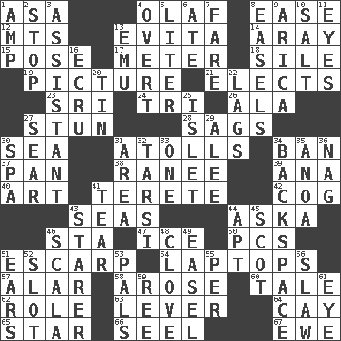 ACROSS 1. White ___ sheet 4. Norwegian king 8. Relaxation 12. Mountains (abbr.) 13. Webber/Rice musical 14. Like ___ of sunshine 15. Airs 17. Distance measurement 18. Filth; sediment 19. Photo 21. Chooses 23. Indian title of respect (Mr.) 24. Three (prefix) 26. In the manner of 27. Surprise greatly 28. Sinks 30. Ocean 31. Ringlike coral islands and reefs 34. Prohibit 37. Baking dish 38. Indian princess (variant) 39. Santa ___, CA 40. Tate display 41. Cigar-shaped 42. Gear tooth 43. Oceans 44. "____ silly question..." 46. R.R. building 47. Frozen water 50. Personal Computers (abbr.) 51. Fortification 54. Portable computers 57. Having or resembling wings 58. Came up 60. Lie 62. Hero or heavy, e.g. 63. Prying instrument 64. Island 65. Play the lead 66. Stitch closed the eyes of (a falcon) 67. She-sheep DOWN 1. Electrical Unit 2. Cease 3. Helper 4. Unconcealed 5. 61 cubic inches 6. Had dinner 7. Conductor's collection 8. Artist's stands 9. N. Chile seaport 10. Table seasoning 11. Snake ____ (dice throw) 13. Australian flightless bird 16. Shade of tan 20. Metal container 22. Falls behind 25. Small island 27. Wither 29. Toward shelter 30. Health resort 31. Length times width 32. Tarsus (plural) 33. Single 34. Keyboard key 35. Small Philippine buffalo 36. Tired old horse 41. Rend 43. A viewer who gazes fixedly 44. Fitting 45. Native of Scotland 46. Any of the three canals of the cochlea 48. Garlic unit 49. Artist's stand 51. Hearing organs 52. Position in a hierarchy or organization 53. Friends 55. For each 56. Cole _ (cabbage dish) 59. To riddle 61. Sight organ
