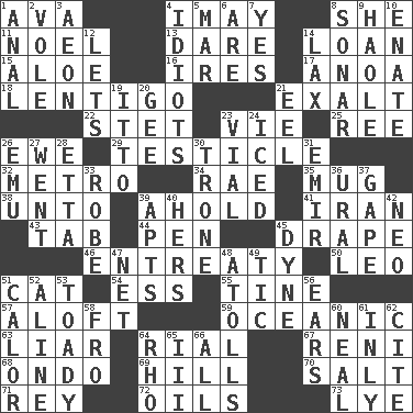 ACROSS 1. Actress Gardner 4. "If ____ say so..." 8. A female animal or person 11. Christmas carol 13. Have the gumption 14. Grant temporary use of 15. Medicinal plant 16. Angers 17. Small Philippine buffalo 18. Small, flat, pigmented spot on the skin 21. Honor 22. Proofreading order 23. Compete 25. To separate or throw off 26. She-sheep 29. One of the two male reproductive glands 32. Paris' subway 34. Actress Charlotte 35. Java container 38. To (old English) 39. Hold, grip (Informal) 41. SW Asia republic 43. Keyboard key 44. Fenced enclosure 45. Window treatment 46. Plea 50. Lion 51. Domesticated feline 54. Curvy letter 55. Prong on a fork 57. High up in or into the air 59. Pertaining to the sea 63. One who doesn't tell the truth 64. Monetary unit of Yemen 67. Painter Guido (1575-1642) 68. Southwest Nigerian state 69. Land elevation 70. Table seasoning 71. Marina Del _, California 72. Lubricates 73. Sodium hydroxide DOWN 1. Of or related to the anus 2. Grand slam 3. A really long time 4. Foolish or stupid persons 5. Third mo. 6. "We ___ not amused" (Victoria) 7. It is so 8. Echolocation 9. White Person, in Hawaii 10. Maternal 12. Allows 14. Not strict 19. "Tell ____ the Marines!" 20. Unit of force equal to gravity 21. Snakelike fish 23. Small bottle 24. On the rocks 26. Australian flightless bird 27. Left 28. Singer James 30. Heavy duty weighing machine 31. Arab leader 33. Loose flowing garment 36. Mountain range 37. Yawn 39. Flats, for short 40. Possessive pronoun 42. Modern: prefix 45. Centimeter-gram-second unit of force 47. Fish or hair follower 48. Ringlike coral islands and reefs 49. Nervous spasm 51. Bodily heat indicating an inflammation 52. Place in a line 53. Sycophant 56. Hearing organs 58. Away 60. Be tempered by heat 61. Inwardly 62. Quote 64. 17th letter of the Greek alphabet 65. One more than two 66. 100%