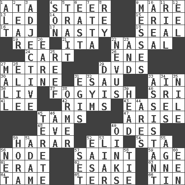 ACROSS 1. _ moment's notice (2 wds.) 4. Navigate 9. Female horse 13. Directed 14. Declaim 15. 4th largest of the Great Lakes 16. _ Mahal 17. Thoroughly unpleasant 18. Lick closed 19. To separate or throw off 21. Call ___ day 22. Relating to the nose 24. Haul 26. Compass dir. 27. Distance measurement (Brit.) 29. Movie discs 30. Place in a line 31. He sold his birthright 33. The 18th letter of the Arabic alphabet 36. 54 in ancient Rome 37. Out of fashion; old fashioned 40. Indian title of respect (Mr.) 41. Area sheltered from the wind 42. Basketball hoops 43. Artist's stand 45. Scottish caps 47. Get up 48. Night before a holiday 49. Lyric poems 50. Ethiopian city, capital of Harari 52. Connecticut Ivy Leaguer 54. R.R. building 56. Thickened enlargement 57. Inhabitant of Heaven 59. Personal question 61. Part of Q.E.F. 62. 1973 Nobel Price Winner (Physics) Leo 63. Compass dir. 64. Not wild 65. Laconic 66. Shallow baking pan DOWN 1. The first octave above the treble staff 2. Rend 3. Descriptive word 4. Male child 5. Distinguishing feature 6. 90 degrees 7. Singer James 8. Marina Del _, California 9. Makes clutter 10. Length times width 11. Monetary unit of Yemen 12. Snakelike fish 20. Merit 22. Congenital growth or mark on the skin 23. Added to 25. Coral ridge 27. Shopping center 28. Writer Wiesel 29. Raised platform 31. Armor plate that protects the chest 32. Symbol (abbr.) 33. Helper 34. Angers 35. Mediterranean tributary 38. Channel Islands abalone 39. Froth on beer 44. Ancient Greek god of war 45. Cigar-shaped 46. Actress Gardner 49. Pig sounds 50. Israeli folk dance 51. First man 52. Comfort 53. One who doesn't tell the truth 55. Hindu god of fire 56. Fish or hair follower 57. Put into a specified state 58. Make a knot 60. Car or cant ending
