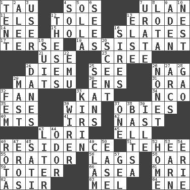 ACROSS 1. The 19th letter of the Greek alphabet 4. Mayday 7. ____ Bator 11. Raised railways 12. Lacquered or enameled metalware 13. Eat (away) 14. Born 15. Hollow 16. Chalkboards 17. Laconic 19. Helper 21. Purpose 23. Algonquian 24. South Vietnam president (1954) 25. Observe 26. Tired old horse 29. Taiwanese island in East China Sea 30. Followers of ems 31. Mouth or opening 32. Air blower 33. Krazy ___ of comics 34. Non-commissioned officer (abbr.) 35. Compass dir. 36. Acquire through effort 37. Off-Broadway awards 40. Mountains (abbr.) 41. Big collection agency 42. Political cartoonist Thomas 43. Australian parrot (variant) 45. Pipe bend 46. Dwelling 51. Giggle 55. Speaker 56. Falls behind 58. Rowing implement 59. Carrier 60. At sea 61. Medical imaging device (abbr.) 62. SW Saudi Arabia district 63. Cartoonist voice _ Blanc 64. Compass dir. DOWN 1. Portable shelter 2. Toward shelter 3. One who makes use of a thing 4. "Barney Miller" actor Jack 5. Water jar 6. Perceives with the eye 7. A salt of uric acid 8. Globular water bottle used in Asia 9. An important port of Yemen 10. Egg locale 12. College papers 13. Otherwise 16. Male parents of animals 18. Set of matching outer garments 20. Aroma 22. Australian flightless bird 24. Natives or inhabitants of Denmark 25. Actors Connery and Penn 26. Music written for nine 27. Arches 28. E Mali city 29. Vertical spar for supporting sails 32. Opposite of masc. 33. Japanese brewing company 36. One who wires 37. Single 38. Greek mezzo-soprano Agnes 39. Small island 43. 61 cubic inches 44. Aroma 46. Round or rotation of duties 47. Greek god of love 48. Suttee (variant) 49. Dollar (slang) 50. Comfort 52. Residence 53. Merit 54. 4th largest of the Great Lakes 57. Set
