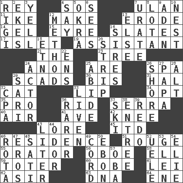 ACROSS 1. Marina Del _, California 4. Mayday 7. ____ Bator, Mongolia 11. Mamie's husband 12. Cause to be 13. Wear away 14. Set 15. Jane of fiction 16. Chalkboards 17. Small island 19. Aide 21. Definite Article 23. Family _ (genealogy) 24. At once, immediately (arch.) 25. "We ___ not amused" (Victoria) 26. Health resort 29. Large numbers or amounts 30. Again 31. Actor Linden 32. Domesticated feline 33. Mouth edge 34. Choose 35. Adept person 36. To free from 37. Father Junipero _ 40. Atmosphere 41. "___ Maria" 42. Leg joint 43. Old wives' tales, e.g. 45. It would 46. Home 51. Makeup applied to the cheeks 55. Speaker 56. Mitch Miller's instrument 58. Pipe bend 59. Carrier 60. Loose flowing garment 61. Luau accessory 62. SW Saudi Arabia district 63. Heredity factor (abbr.) 64. Compass dir. DOWN 1. Swiss mountan, "Queen of the Mountains" 2. Makes supply last 3. Shout 4. Declare 5. Gumbo ingredient 6. Perceives with the eye 7. A salt of uric acid 8. Globular water bottle used in Asia 9. An important port of Yemen 10. Egg locale 12. Mode 13. Otherwise 16. Titles for men of rank and authority 18. Inactive volcano in Sicily 20. Empty completely 22. Followers of ems 24. Thespian 25. Remain 26. Dinah or Pauly 27. Dad 28. Keyboard modifier key 29. Indian skirt 32. Numbers guy (abbr.) 33. Make or become more lively 36. More valued for its uncommonness 37. What Jean-Claude Killy likes to do 38. Main course 39. Redecorate 43. 61 cubic inches 44. Aroma 46. Round or rotation of duties 47. Greek god of love 48. Suttee (variant) 49. Drawstring 50. Inky black, to poets 52. Ubangi River tributary 53. Small, secluded valley 54. Writer Wiesel 57. Chief or king in Benin or Nigeria