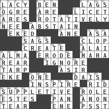 ACROSS 1. Made of lace 5. Benjamin's nick name 8. Falls behind 12. Legendary monster 13. "We ___ not amused" (Victoria) 14. It is permitted: Lat. 15. Ancient Greek god of war 16. Producing rotation 19. Born 20. Choose not to consume 21. Made supply last 23. One (Scot) 24. White ___ sheet 27. Settles 30. Hoof sound 31. Cause to be 34. Mountain range southwest of Kyrgyzstan 35. _ mater 38. Eat (away) 40. Hindu Mythology: god of death 41. Buttocks 42. Dismiss 44. Canvas cover 45. SW Saudi Arabia district 46. Supplement with great effort 47. Single 50. Raised platform 53. Stimulate to action 57. To free from 59. Supplying deficiencies 63. Hero or heavy, e.g. 64. _____ Park, CO 65. Baking dish 66. Soon (poet.) 67. Pull into pieces 68. Compass dir. 69. Inconspicuous attention getter DOWN 1. Grant temporary use of 2. Match 3. Small stream 4. Affirmative reply 5. Sharp remark 6. Greek god of love 7. Remaining after all deductions 8. 54 in ancient Rome 9. Adept person 10. Set 11. Filthy place 14. Actor's bit 17. Auto club (abbr.) 18. Shallow baking pan 20. The sixth month of the Jewish calendar 22. Fortification 24. Silent film actress Nazimova 25. Fly high 26. Capital of Western Samoa 28. Unit of force equal to gravity 29. Indian skirt 30. Device for capturing images 32. Coat; cloak 33. Pulitzer Prize-winning author Ferber 35. Johnson of "Laugh-In" 36. Path through which fluid escapes 37. Female horse 39. Greek goddess of the dawn 43. Travel on or in a vehicle 47. Petroleums 48. Compass dir. 49. Eastern Standard Time (abbr.) 51. Removes the wrinkles 52. Grain storage towers 54. Corncob 55. _ the terrible 56. French philosopher Descartes 58. Gouge 59. Put into a specified state 60. Purpose 61. Parent Teacher Association (abbr.) 62. For each 63. Reproach for some lapse or misdeed
