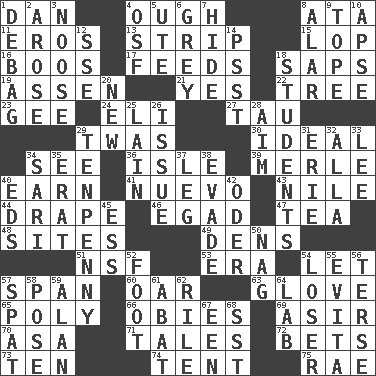 ACROSS 1. One of the 12 tribes of Israel 4. Ending for "Through" and "Enough" 8. "One Day ___ Time" 11. Greek god of love 13. Remove all contents or possession from 15. Trim (branches) 16. Expressions of contempt or scorn 17. Eats 18. Plant excrements 19. NE Netherlands city 21. Affirmative reply 22. Woody plant 23. Unit of force equal to gravity 24. Biblical high priest 27. The 19th letter of the Greek alphabet 29. It was, poetically 30. Standard of perfection 34. Perceive with the eye 36. Small island 39. Haggard of country music 40. Merit 41. New (sp.) 43. "Death on the ____" 44. Window treatment 46. Mild oath 47. Afternoon social gathering 48. Settings 49. Cub Scout units 51. Science/research agcy. 53. Period 54. Allow 57. Connect, as a bridge 60. Rowing implement 63. Michael Jackson trademark 65. Much (prefix) 66. Off-Broadway awards 69. SW Saudi Arabia district 70. White ___ sheet 71. Lies 72. Stakes 73. Nine, plus one 74. Portable shelter 75. Actress Charlotte DOWN 1. Debunk (Brit. slang) 2. Came up 3. Trap for birds or small mammals 4. Order of Saint Francis (abbr.) 5. Shoshoni 6. Jennifer or Joel 7. Flintstone garb 8. Having or resembling wings 9. Drink excessively 10. Domed church section 12. Compass dir. 14. Inconspicuous attention getter 18. SAT takers 20. ___ Haven, CT 25. (Had) reclined 26. Come out of 28. Direct toward a target or goal 29. 3-inch nail 31. One of the Great Lakes 32. Silent film actress Nazimova 33. Area sheltered from the wind 34. Indian skirt 35. Part of Q.E.F. 37. Part of a journey 38. Elude 40. Begley and Asner 42. Baltic tributary 45. Double-curved letter 50. Tired old horse 52. One third of a yard 54. Failure 55. Webber/Rice musical 56. Laconic 57. Petty quarrel 58. Airs 59. Actor Alda or Thicke 61. Blind as ____ 62. Cause heat under the collar 64. Experiment locale 67. Car or cant ending 68. Fast jet (abbr.)