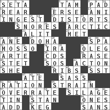 ACROSS 1. Bristle 5. Scottish cap 8. Writing tablet 11. Buttocks 12. Celtic language 13. Black tropical American cuckoo 14. Swallow 17. What propaganda does 19. Sounds asleep 21. Northern region 22. Set down 23. Was introduced to 24. A saturated hydrocarbon 27. Capital of the state of Qatar 29. Health resort 32. With motion or animation 34. Retirement account (abbr.) 36. Cassini of fashion 37. Johnson of "Laugh-In" 38. Music discs 39. To erase 40. Proofreading order 41. Mayday 42. Gambison 43. A female animal or person 44. Chest bones 46. Fast jet (abbr.) 47. Had dinner 50. Backtalk 52. Food allowance for one day 55. Put through a sieve 57. Make much ado about nothing 59. Fodder prepared in a silo 62. Shallow baking pan 63. Comedian Laurel of Laurel & Hardy 64. Washington bills 65. Increase 66. Barrel 67. Without DOWN 1. Indian title of respect (Mr.) 2. Car or cant ending 3. Labels 4. Sports stadium 5. Three (prefix) 6. Indian state 7. Distance measurement (Brit.) 8. Role in a play 9. Opposed to 10. Flat circle 12. Begley and Asner 15. Twentieth part of a lira 16. Musical group of three 18. Sep. follower 20. Value system 24. Collect or gather 25. Compass direction 26. First name in cosmetics 28. Zeal 29. Narrow boards 30. Mexican monetary units 31. Representative 33. Arrange properly for use 35. Help 36. The grampus (Milton) 42. Slender Brazilian palm 45. Long, evenly shaped pieces 47. Atmosphere 48. Cod relative 49. Related on the mother's side 51. Grain storage towers 52. Round or rotation of duties 53. Enthusiastic 54. Be inclined (to) 55. Elected rep. 56. Nanny 58. Label 60. Commissioned mil. rank 61. Double-curved letter