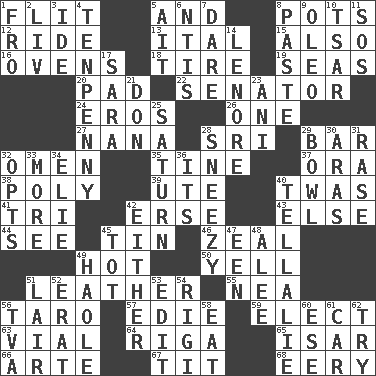 ACROSS 1. Sudden quick movement 5. Added to 8. Cooking vessels 12. Travel on or in a vehicle 13. Slanted text style (abbr.) 15. In addition 16. Baking chambers 18. Hoop that covers a wheel 19. Oceans 20. Groovy apt. 22. Legislator 24. Greek god of love 26. Single 27. Nanny 28. _ Lanka 29. Long, evenly shaped piece 32. Sign of things to come 35. Prong on a fork 37. Mouth or opening 38. Many (prefix) 39. Shoshoni 40. It was, poetically 41. Three (prefix) 42. Celtic language 43. Otherwise 44. Observe 45. Shallow baking pan 46. Ardor 49. Being at a high temperature 50. Shout 51. Cordwainer's material 55. Teachers' org. 56. Edible starchy tuberous root 57. Singer Brickell 59. Voters do this 63. Small bottle 64. Capital of Latvia 65. Austrian river, tributary to the Danube 66. Johnson of "Laugh-In" 67. Teat (slang) 68. Suggestive of the supernatural DOWN 1. Back 2. 54 in ancient Rome 3. Binary compound 4. 3-inch nail 5. Small island 6. Nuclear Threat Initiatives 7. Have the gumption 8. Thick mixture 9. Margarine 10. Russian ruler of old 11. Distress signal 14. Poe poem 17. "Two Mules for Sister ____" 21. Spanish title 23. Cuckoo 25. Titan orbits this 28. Dwarf with a sinus problem 29. Soup holder 30. Ancient river in northeast Turkey 31. Raze (variant) 32. Elects 33. Greater amount 34. Writer Wiesel 36. ___ a Wonderful Life 40. Copy Pinocchio 42. One or the other of two 45. Small child 47. Car or cant ending 48. Toward shelter 49. White Person, in Hawaii 51. Den 52. Part of Q.E.F. 53. Prepare for publication 54. Swiss mountan, "Queen of the Mountains" 56. Federal power corp. 58. Ingest 60. Compass dir. 61. Auto 62. Attempt