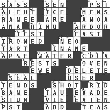 ACROSS 1. Backtalk 5. Elected rep. 8. Pacific Standard Time (abbr.) 11. Native American of Southwest Alaska 13. Frozen water 14. Not women's 15. Indian princess (variant) 16. "We ___ not amused" (Victoria) 17. Small Philippine buffalo 18. Santa ___, CA 19. Tall New Zealand timber tree 21. Zeal 22. Trial 24. Compass direction 25. Pressed 27. Modern: prefix 29. Small pie 30. Lacking in sense or substance 32. Domed church section 33. Wetness 35. Root beer relative 39. Musical pauses 41. Baking chamber 42. She-sheep 43. Keyboard key 45. Lick closed 48. One who uses or employs something 49. Looks after 50. Went for two points 52. To free from 55. Object of repulsion 56. The 19th letter of the Greek alphabet 57. Dodge 59. Surprise greatly 60. Compete 61. Consumed 62. 23rd letter of the Greek alphabet 63. Find the sum of 64. Beverages made from leaves DOWN 1. "Two Mules for Sister ____" 2. Actor Alda or Thicke 3. Legislators 4. Take to court 5. Thailand, formerly 6. Shade of tan 7. Born 8. Hangs 9. Snout, nose 10. Russian ruler of old 12. Laconic 14. Hindu Mythology: god of death 20. It would 21. A really long time 23. Keyboard key 25. Call ___ day 26. Reproach for some lapse or misdeed 27. Compass dir. 28. Hearing organ 30. ___ a Wonderful Life 31. Learning spot: Fr. 33. Compass dir. 34. Had dinner 36. Make much ado about nothing 37. Allow 38. A saturated hydrocarbon 40. Snakelike fish 43. Superhero pair 44. First name in cosmetics 45. Theater features 46. World-weariness 47. An important port of Yemen 49. Cook's measure (abbr.) 50. Stated 51. Took on color 53. It may be bright or harebrained 54. Habitations of wild animals 56. Federal power corp. 58. Large container