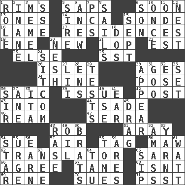 ACROSS 1. Basketball hoops 5. Plant excrements 9. Within a short period 13. Singles 14. South American Indian 15. Message 16. Unable to walk 17. Dwellings 19. Compass dir. 20. ___ Haven, CT 21. Chop off 22. Eastern Standard Time (abbr.) 23. Otherwise 25. Fast jet (abbr.) 26. Small island 30. Matures 34. One or ones belonging to thee 35. Introduce or present, as a question 36. Ketch in the Levant 39. Come out of 42. Mail 43. To the inside or interior of 44. Sadhe (variant) 46. 480, 500 or 516 sheets of paper 47. Spanish missionary in California 48. Director Reiner 51. Like ___ of sunshine 54. Take to court 57. Wind 58. Label 60. Opening into something insatiable 62. Interpreter 65. "Two Mules for Sister ____" 66. Match 67. Docile 68. Is not 69. French philosopher Descartes 70. Takes to court 71. Inconspicuous attention getter DOWN 1. Hero or heavy, e.g. 2. Lacking in sense or substance 3. Klaipeda city 4. Compass dir. 5. Male parent of an animal 6. Afresh 7. Personal Computers (abbr.) 8. Travel by water 9. Male offspring 10. Single time 11. Lyric poems 12. A home for chicks 15. Back-to-school mo. 18. Two (Sp.) 20. Delicate 24. "Cheers" or "Ellen" 27. Cards in a Roman deck? 28. Followers of ems 29. Trials 30. Become visible 31. Thick or sticky substance 32. Double-curved letter 33. Put into a specified state 36. Title for a knight 37. A saturated hydrocarbon 38. Call ___ day 40. Purpose 41. Hearing organ 45. To draw with force 48. To erase 49. Petroleum 50. Naughty children 52. Collect or gather 53. Tall tales 54. Play the lead 55. Goad 56. Merit 58. Heavy book 59. Ancient Greek god of war 61. Electrical Unit 63. Born 64. The 19th letter of the Greek alphabet 65. Small drink