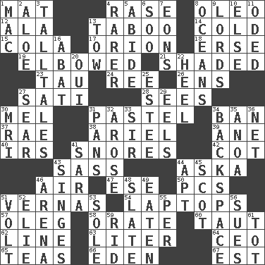 ACROSS 1. Floor covering 4. To erase 8. Butter sub 12. Insect wing 13. Off limits 14. Chilled 15. Root beer relative 17. Greek mythologigal hunter 18. Celtic language 19. Turned at an angle; bent 21. Cast a shadow over 23. The 19th letter of the Greek alphabet 24. To sift 26. Followers of ems 27. Suttee (variant) 28. Observes 30. Cartoonist voice _ Blanc 31. Soft color 34. Forbid 37. Actress Charlotte 38. Satellite of Uranus 39. One (Scot) 40. Big collection agency 41. Sounds asleep 42. Small bed 43. Backtalk 44. "____ silly question..." 46. Wind 47. Compass dir. 50. Personal Computers (abbr.) 51. Actresses Bloom and Felton 54. Portable computers 57. Cassini of fashion 58. Speak pompously 60. Strained 62. Actor's bit 63. 61 cubic inches 64. Corporate head (abbr.) 65. Beverages made from leaves 66. Genesis locale 67. Eastern Standard Time (abbr.) DOWN 1. Big _ 2. _ vera 3. Baron Munchausen's specialties 4. Less widely known 5. Stay 6. "Barney Miller" actor Jack 7. Immeasurably long periods of time 8. Seas 9. Domineers 10. Otherwise 11. Wrote a lyric poem 13. Pull behind 16. Blind as ____ 20. Fr. "Yes" 22. Person who is morally reprehensible 25. First name in cosmetics 27. Shrivel 29. Snakelike fish 30. Medical imaging device (abbr.) 31. Baking dishes 32. Came up 33. Title for a knight 34. Keyboard key 35. Small Philippine buffalo 36. Fish or hair follower 41. "Two Mules for Sister ____" 43. Burns superficially 44. Fitting 45. Native of Scotland 46. Sports stadium 48. Chalkboard 49. Consumed 51. Electrical Unit 52. Writer Wiesel 53. Flatfish 55. For each 56. Institutes legal proceedings 59. To free from 61. Small child