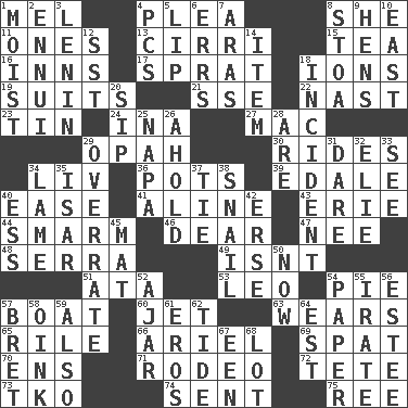 ACROSS 1. Cartoonist voice _ Blanc 4. Entreaty 8. A female animal or person 11. Washington bills 13. High-altitude cloud 15. Beverage made from leaves 16. Taverns 17. Small fatty European fish 18. Charged particles 19. Sets or collections 21. Compass dir. 22. Political cartoonist Thomas 23. Shallow baking pan 24. _ tizzy (2 wds.) 27. Apple computer (short form) 29. Brightly colored fish 30. Amusement-park features 34. 54 in ancient Rome 36. Plant holders 39. Peak District village in England 40. Comfort 41. Place in a line 43. One of the Great Lakes 44. Excessive but superficial compliments 46. Letter starter 47. Born 48. Father Junipero _ 49. Is not 51. _ moment's notice (2 wds.) 53. Lion 54. Sliced dessert 57. Water vessel 60. Passenger plane 63. Puts on (as clothing) 65. Cause heat under the collar 66. Satellite of Uranus 69. Argument over a trivial matter 70. Followers of ems 71. Cowboy competition 72. False hair 73. Ring climax 74. Emitted 75. To separate or throw off DOWN 1. Damp 2. World-weariness 3. Soviet premier 1918-24 4. Personal Computers (abbr.) 5. Mouth edge 6. Blunders 7. Ancient river in northeast Turkey 8. Portico 9. Coop moms 10. Compass direction 12. Fast jet (abbr.) 14. Detail 18. Event 20. Small drink 25. California wine valley 26. Hold, grip (Informal) 28. "We ___ not amused" (Victoria) 29. Make much ado about nothing 31. Have the gumption 32. Writer Wiesel 33. Observe 34. Unable to walk 35. Austrian river, tributary to the Danube 37. Make a knot 38. Slow-paced one 40. Curvy letter 42. Celtic language 45. Floor covering 50. At this time 52. Partly open 54. Some stationery 55. Feeling or showing extreme anger 56. First name in cosmetics 57. Cy Young winner Saberhagen 58. Pig sound 59. In addition 61. Greek god of love 62. Event that recurs at intervals 64. Eastern Standard Time (abbr.) 67. Car or cant ending 68. Car dealer's back yard