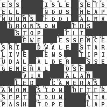 ACROSS 1. Double-curved letter 4. Capri or Wright 8. Arranges properly for use 12. Pipe bend 13. Good sense 14. Pile 15. Parts of speech 18. Lowest support of a structure 19. _ mater 20. "Death Wish" actor 22. Begley and Asner 23. Close up, plug up 24. Biblical high priest 25. She-sheep 26. Gist 30. Indian title of respect (Mr.) 33. A sleeping potion; an opiate (poet.) 36. Play the lead 37. Not recorded 39. Followers of ems 40. Native american tent (variation) 41. Allodial 42. Tree or shrub in the Birch family 44. Compass dir. 45. Commissioned military rank 47. Order of Saint Francis (abbr.) 50. By way of 51. ____ Jay Lerner 53. Directed 54. Devices for capturing images 57. At once, immediately (arch.) 59. The Jewish people; Israel 61. Prevent from occurring 63. Back-to-school mo. 64. Goddess of spring and wife of Bragi 65. _ moment's notice (2 wds.) 66. Romantic infatuation 67. Drink excessively 68. Infant locale DOWN 1. Car or cant ending 2. Messy guy 3. Plays smoothly or legato 4. A message received and understood 5. Within a short period 6. Nilotic language 7. Eastern Standard Time (abbr.) 8. Most questionable 9. Snakelike fish 10. Scottish cap 11. Health resort 16. Observe 17. Frozen precipitation 21. Drove too fast 22. Raised railways 24. Compass dir. 26. Otherwise 27. Nuclear Threat Initiatives 28. Balmoral and tarboosh 29. 4th largest of the Great Lakes 30. Strike heavily 31. Travel on an animal 32. "Terrible" tsar 34. Water source 35. Added to 38. Veterans Day date 42. Auto club (abbr.) 43. Wander aimlessly 46. To free from 48. Downhill vehicle 49. Conductor's collection 52. Brizilian seaport 53. Chops off 54. Clever action or accomplishment 55. Queen of England 1702-14 56. Bristle 57. Viper 58. Teachers' org. 59. Be seated 60. Wedding promise 62. Hit sharply and swiftly