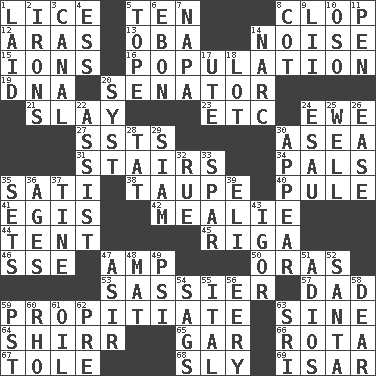ACROSS 1. Louse (plural) 5. Nine, plus one 8. Hoof sound 12. Caspian sea tributary 13. Chief or king in Benin or Nigeria 14. Annoying sound 15. Charged particles 16. Census information 19. Heredity factor (abbr.) 20. Elected representative 21. Kill 23. And so on (abbr.) 24. She-sheep 27. Fast planes 30. Toward the sea 31. Flight of steps 34. Friends 35. Suttee (variant) 38. Grayish beige 40. Whine 41. Armor plate that protects the chest 42. Ear of corn 44. Portable shelter 45. Capital of Latvia 46. Compass dir. 47. Electrical Unit 50. Mouths or openings 53. More impudent 57. Male parent 59. Appease 63. Trig term 64. Bake eggs in their shells 65. Slender fish 66. Roll call or roster of names 67. Lacquered or enameled metalware 68. Wily 69. Austrian river, tributary to the Danube DOWN 1. Put down 2. Metal shackles 3. Lessep's creation 4. Double-curved letter 5. Drink excessively 6. Inky black, to poets 7. California wine valley 8. Small bed 9. Cards in a Roman deck? 10. Bear (Spanish) 11. Writing instrument 14. Drug cop 17. Shoshoni 18. Car dealer's back yard 20. System (abbr.) 22. Help 24. He sold his birthright 25. Not ill 26. Comfort 28. Make lace 29. Thailand, formerly 30. Seem 32. Regret 33. Coast Guard woman 35. Puts into a specified state 36. Ripens 37. Prong on a fork 39. Biblical high priest 43. Russian composer Stravinsky 47. SW Saudi Arabia district 48. Floor protector 49. 23rd letter of the Greek alphabet 51. Goodbye (Sp.) 52. Before Barbara or Clara 54. Sinks 55. Slanted text style (abbr.) 56. Suggestive of the supernatural 58. Letter starter 59. Pacific Standard Time (abbr.) 60. 17th letter of the Greek alphabet 61. Petroleum 62. Before (prefix) 63. Indian title of respect (Mr.)