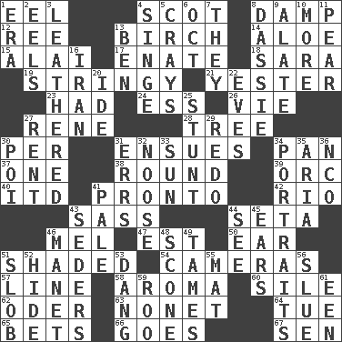 ACROSS 1. Snakelike fish 4. Native of Scotland 8. Moist 12. To sift 13. A tree used for making furniture 14. _ vera 15. Jai ____ 17. Related on the mother's side 18. "Two Mules for Sister ____" 19. Slender, wiry 21. Last 23. Possessed 24. Curvy letter 26. Compete 27. French philosopher Descartes 28. Woody plant 30. For each 31. Follows as a consequence or result 34. Baking dish 37. Single 38. Single shot of ammunition 39. The grampus (Milton) 40. It would 41. Right away 42. _ de Janeiro 43. Backtalk 44. Bristle 46. Cartoonist voice _ Blanc 47. Eastern Standard Time (abbr.) 50. Hearing organ 51. Cast a shadow over 54. Devices for capturing images 57. Actor's bit 58. Scent 60. Filth; sediment 62. Baltic tributary 63. Music written for nine 64. Third day of the wk. 65. Antes 66. Leaves 67. Elected rep. DOWN 1. Epoch 2. Snakelike fish 3. Resembling or made to resemble leather 4. Burn superficially 5. Trading vessels 6. Sep. follower 7. Those things 8. Hyrax 9. Having winglike extensions 10. Greater amount 11. Lightbulb-shaped fruit 13. Benjamin's nick name 16. SW Asia republic 20. Binary compound 22. Nights before holidays 25. Check the growth or development of 27. Monthly bill 29. Redecorate 30. Luau course 31. Blunders 32. Trap for birds or small mammals 33. Player for Phoenix 34. Likenesses of persons 35. Roberta Peters solo 36. Non-commissioned officer (abbr.) 41. Light colored 43. Spring feasts 44. Perceive with the eye 45. Hearing organs 46. French painter Edouard 48. Biscuitlike quick bread 49. Softens 51. Messy guy 52. Flintstone garb 53. Mild oath, euphamism for damn 55. Floor covering 56. Turn sharply 59. Friend of Pooh 61. Car or cant ending