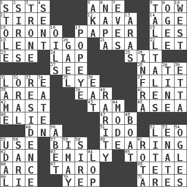 ACROSS 1. Fast planes 5. One (Scot) 8. Pull behind 11. Become fatigued 12. Polynesian shrub of the pepper family 14. Mature 15. U. of Maine site 17. Some stationery 18. French article 19. Small, flat, pigmented spot on the skin 21. White ___ sheet 22. Allow 23. Compass dir. 24. Pet locale 25. Be seated 27. Perceive with the eye 28. Nathan's nickname 31. Old wives' tales, e.g. 35. Potassium hydroxide 37. Secret move to avoid paying debts 38. Type of rug 39. Hearing organ 41. Monthly bill 42. Vertical spar for supporting sails 43. Scottish cap 45. At sea 46. Writer Wiesel 47. Director Reiner 49. Heredity factor (abbr.) 51. Wedding promise 52. Lion 55. Purpose 57. Twice 60. Pulling into pieces 62. One of the 12 tribes of Israel 63. Poet Dickinson 65. Add up to 66. Curve 67. Edible starchy tuberous root 68. False hair 69. Untruth 70. Slangy assent 71. Ancient Greek god of war DOWN 1. Fur scarf 2. Begets 3. Marketplace scale 4. Transmitted 5. Alias (abbr.) 6. California wine valley 7. Nights before holidays 8. Baron Munchausen's specialties 9. Double curve, resembling the letter S 10. 270 degrees 13. Ancient river in northeast Turkey 16. Petroleums 17. Wimpy's pal 20. Highlander 26. Kind of red light 29. Prong on a fork 30. Singer James 31. Unable to walk 32. Relating to the mouth 33. Dwelling 34. Consumed 36. Ingest 40. Noteworthy scarcity 44. Method 48. Water vessel 50. Collude with 52. 61 cubic inches 53. Related on the mother's side 54. Stares 55. Hereditary estate 56. Indian skirt 58. "If ____ say so..." 59. Male parent of an animal 61. Roll call or roster of names 64. Chop off