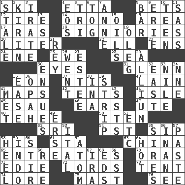 ACROSS 1. What Jean-Claude Killy likes to do 4. Singer James 8. Wagers 12. Become fatigued 14. U. of Maine site 16. Length times width 17. Ancient river in northeast Turkey 18. Seigniories (variant) 20. 61 cubic inches 22. Pipe bend 23. Followers of ems 24. Compass dir. 25. She-sheep 28. Ocean 30. Sight organs 31. American astronaut and politician John 35. A really long time 37. Nuclear Threat Initiatives 40. (Had) reclined 41. Atlas contents 42. Portable shelters 44. Small island 45. He sold his birthright 46. Hearing organs 47. Shoshoni 48. Giggle 50. A distinct part 52. _ Lanka 54. Pacific Standard Time (abbr.) 55. Small drink 58. Part of HMS, perhaps 61. R.R. building 63. Large country 65. Pleas 70. Mouths or openings 71. Singer Brickell 72. Domineers 73. Portable shelter 74. Old wives' tales, e.g. 75. Vertical spar for supporting sails 76. Observe DOWN 1. Lacking originality or spontaneity 2. Japanese brewing company 3. Feeling or showing extreme anger 4. Greek goddess of the dawn 5. Three (prefix) 6. Coat; cloak 7. Singer Murray 8. Oblong piece of solid material 9. One of the Great Lakes 10. Adolescent 11. Backtalk 13. Compass dir. 15. Lubricates 19. Cassini of fashion 21. Marina Del _, California 26. Gone 27. First name in cosmetics 29. Plant genus of onion and garlic 30. Follows as a consequence or result 32. 90 degrees 33. "Death on the ____" 34. Compass dir. 35. Relaxation 36. Brightly colored fish 38. _ tizzy (2 wds.) 39. Remove all contents or possession from 41. Was introduced to 43. Fast planes 49. Celtic language 51. And so on (abbr.) 53. Slanted text style (abbr.) 55. Fathers 56. Empty; void 57. Thick mixture 58. The bottom of a shoe or boot 59. _ china 60. Agitate 62. Smallest unit of an element 64. Being at a high temperature 66. To sift 67. Lyricist Gershwin 68. Begley and Asner 69. Fast jet (abbr.)